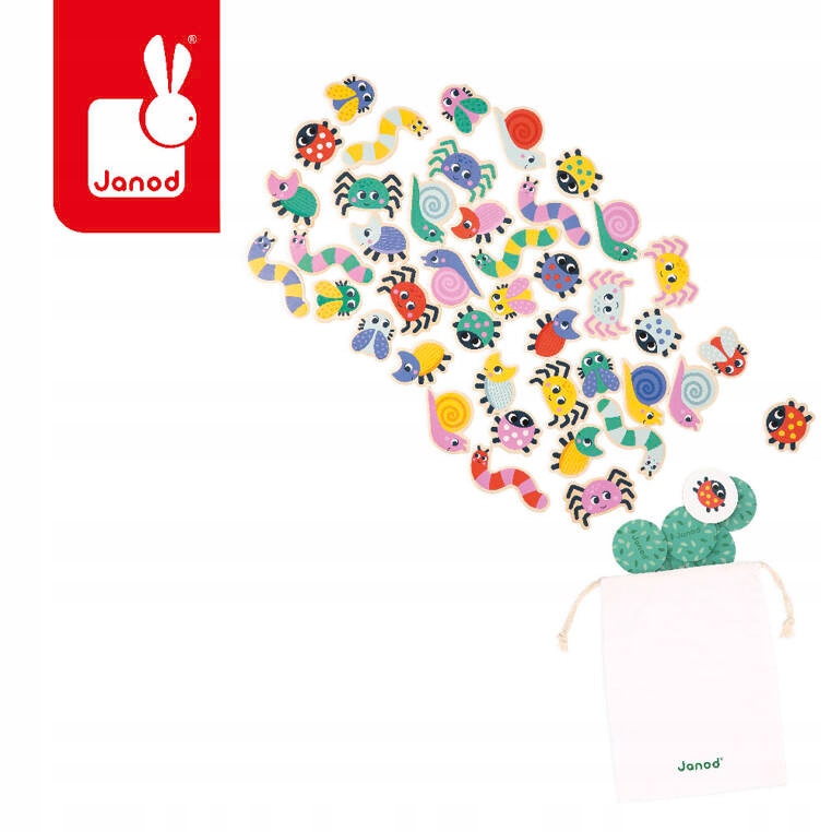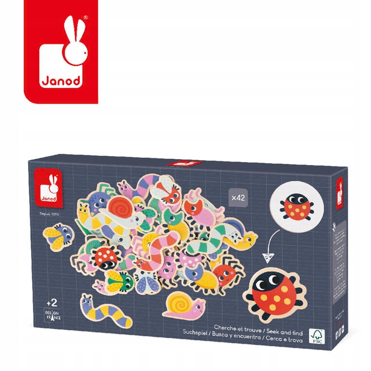 Гра в приховуванні та шукати сад французького бренду Janod - це дуже весело для двох і більше людей - і дітей, і дорослих. Набір включає 42 барвисті дерев’яні комахи (жуки, дощові черв'яки, павуки, сонечки, краватки з лука та равлики - 7 кожного типу, але один одного кольору) та однакову кількість картонних мікросхем у сумці. Мета гри - якнайшвидше знайти істот серед роїв, а хмари, вказані намальованим маркером. Хто знаходить найбільше - виграє.