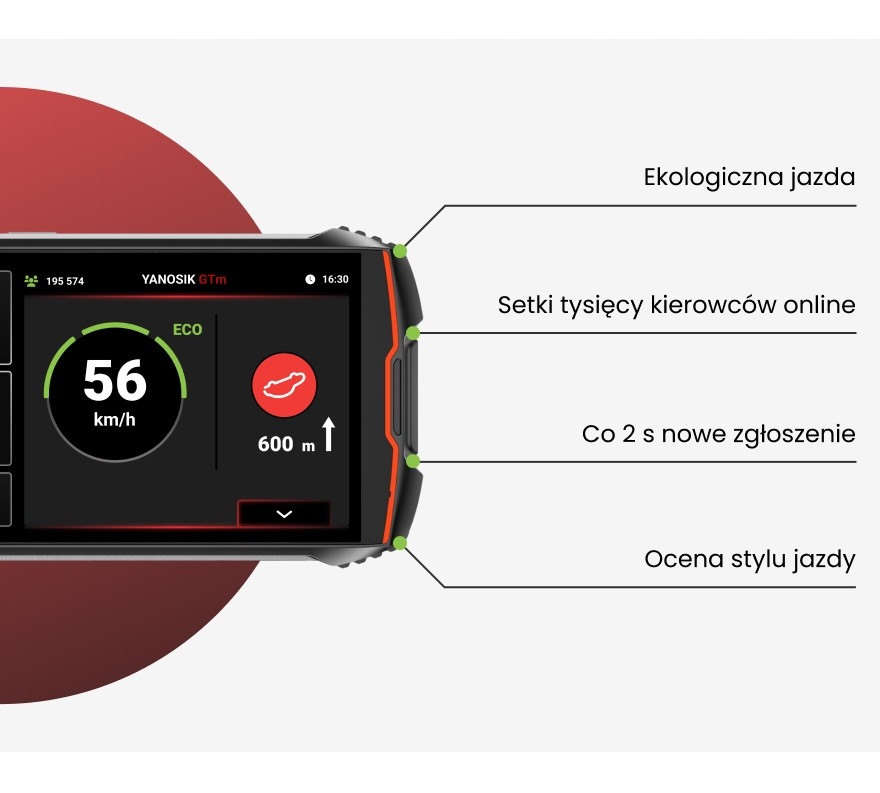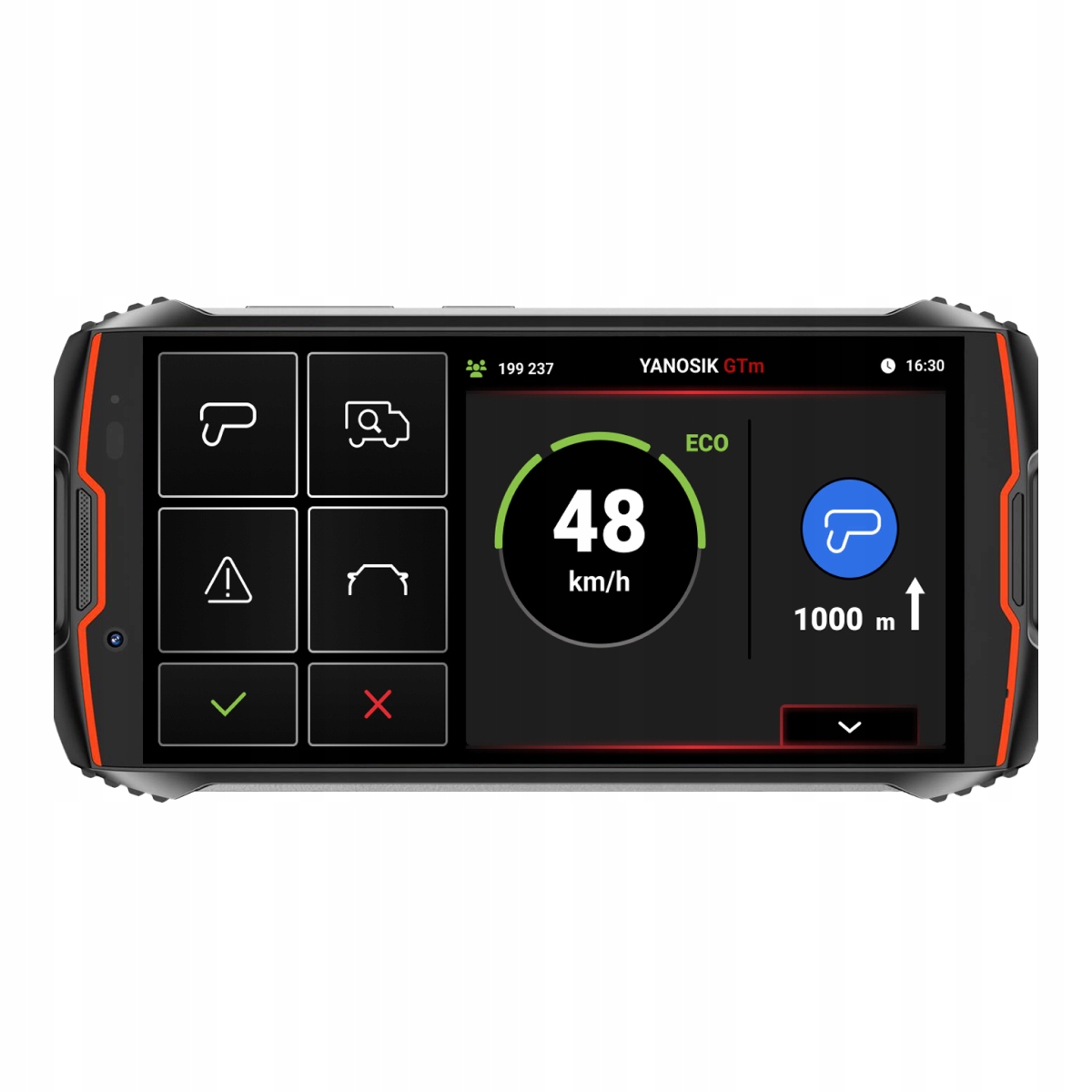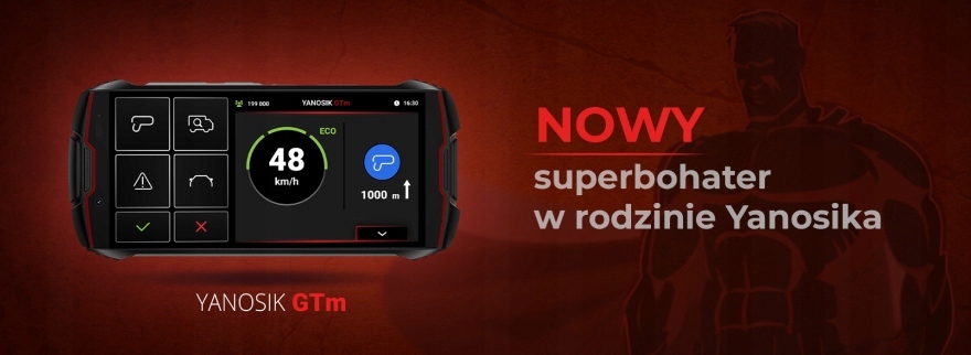 Yanosik GTm — це новий, компактний пристрій із сімейства Yanosik. Оснащений сенсорним екраном, він забезпечує інтуїтивно зрозумілу та плавну роботу. Ви можете встановити їх у свій автомобіль і бути в курсі всіх подій на маршруті. Підключіть їх до програми Y24 і отримайте: