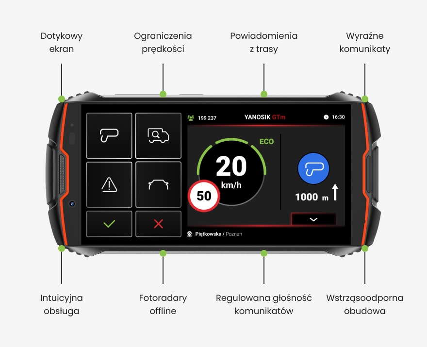Ви можете керувати Yanosik GTm дотиком, що робить взаємодію з пристроєм набагато плавнішою. Ви можете легко та зручно додавати свої звіти за допомогою сенсорної панелі.