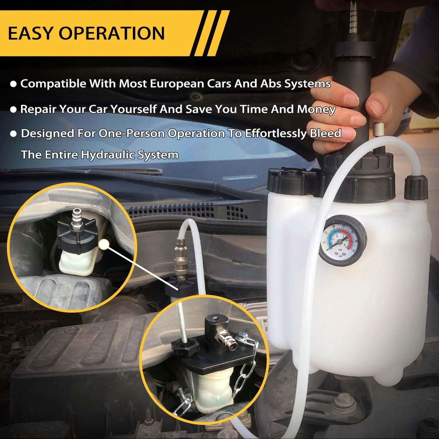 - Багато додатків: Цей набір відповідає більшості гальмівних систем і полегшує видалення повітря та старої рідини з гальмівних ліній, де б і коли -небудь це було необхідне.