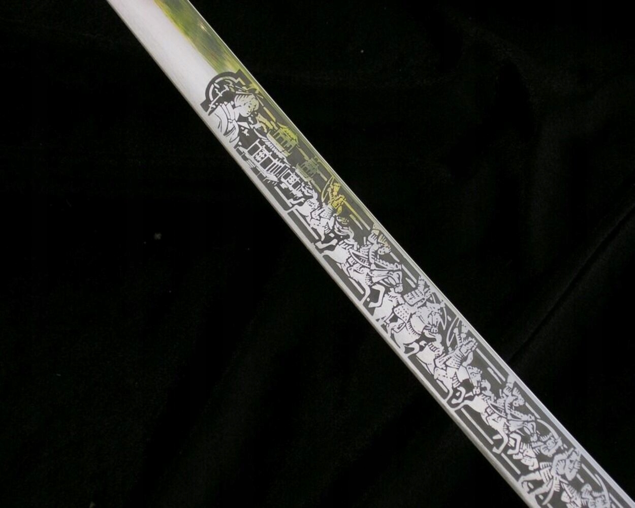 Клинок має унікальне двостороннє гравіювання із зображенням сцен з японської історії