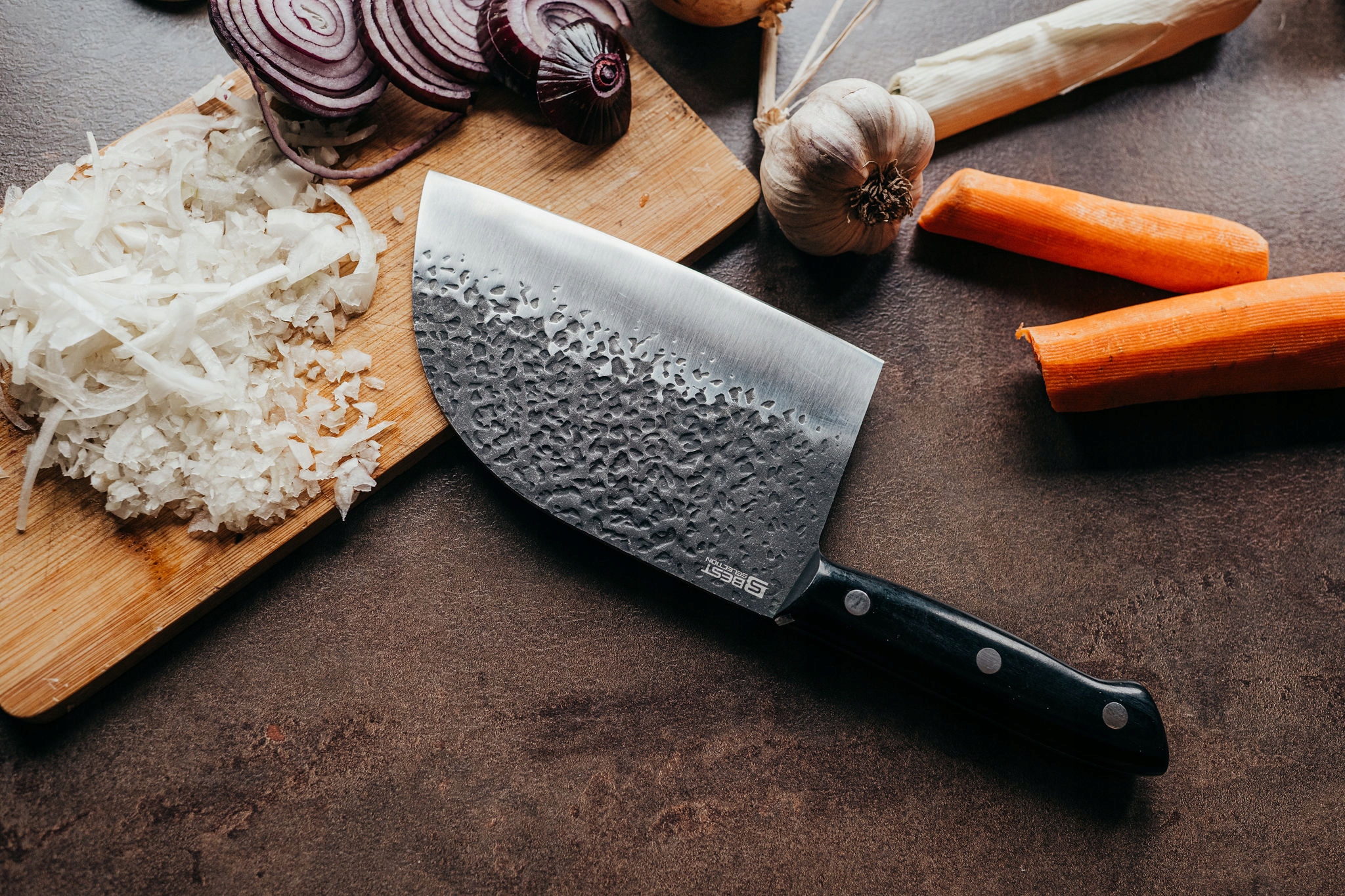 Лезо товщиною 4 мм із високоякісної сталі 4CR14 характеризується винятковою міцністю та здатністю зберігати гостроту. Текстура леза не тільки додає естетики, але й зменшує тертя при різанні. Ручка з палісандрового дерева не тільки ідеально підходить до зовнішнього вигляду леза, але також забезпечує зручність і стабільність рукоятки, що є вирішальним для безпеки та точності під час різання. Цей тесак є практичним вибором для професіоналів і прекрасним доповненням до вашої домашньої кулінарної колекції.