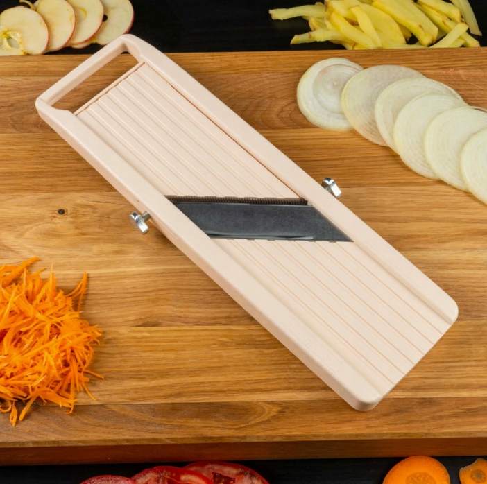 Продукція Benriner характеризується бездоганною якістю виготовлення, простотою експлуатації, компактними розмірами, і можливість заміни лез, ручного регулювання товщини різу та захисту пальців.