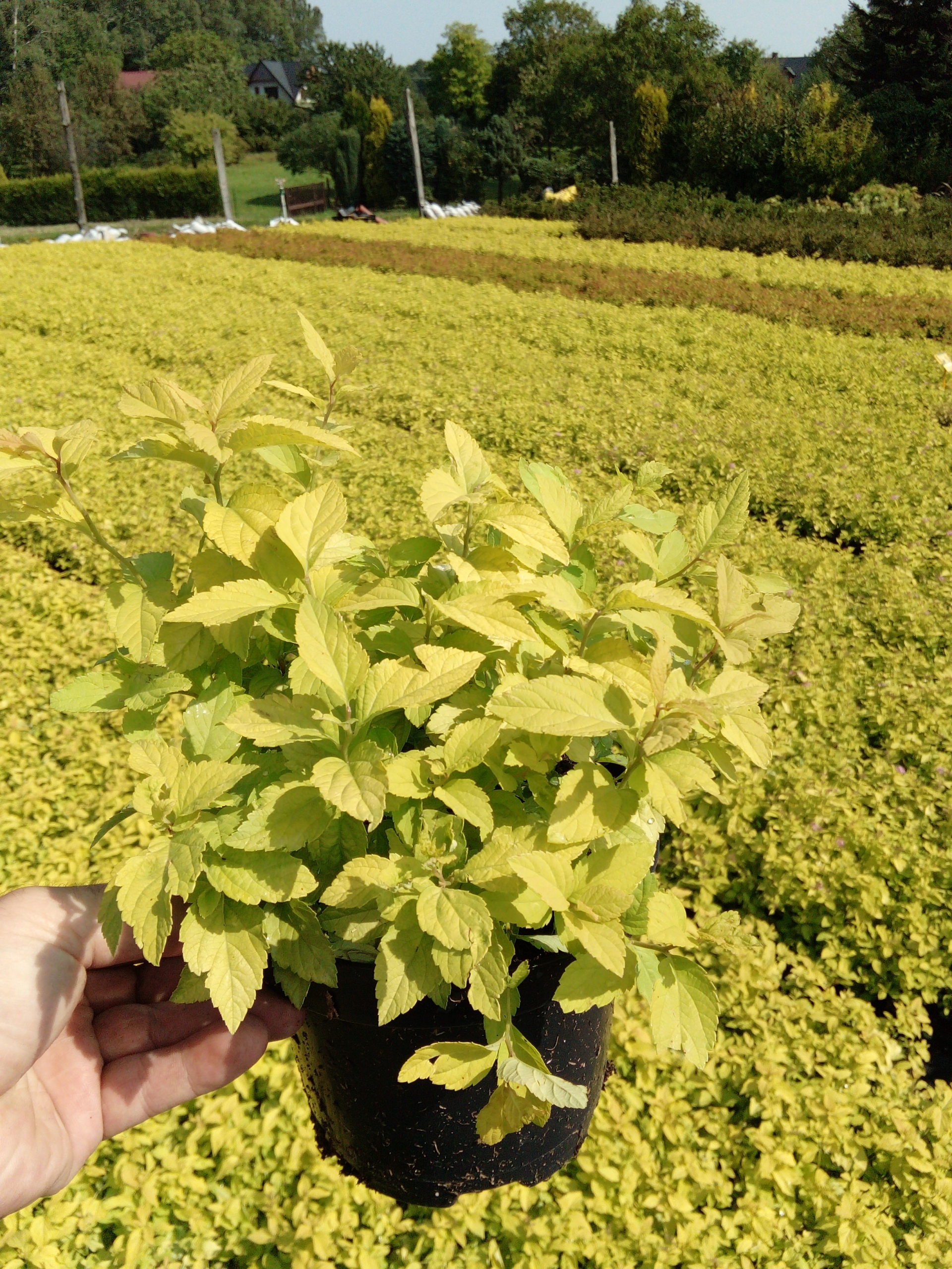 Листя еліптичної форми, гостро загострені, зубчасті по краях, протягом вегетаційного періоду інтенсивно жовті. Рясно цвіте в травні-червні. Ніжно-рожеві квітки зібрані в щитки.