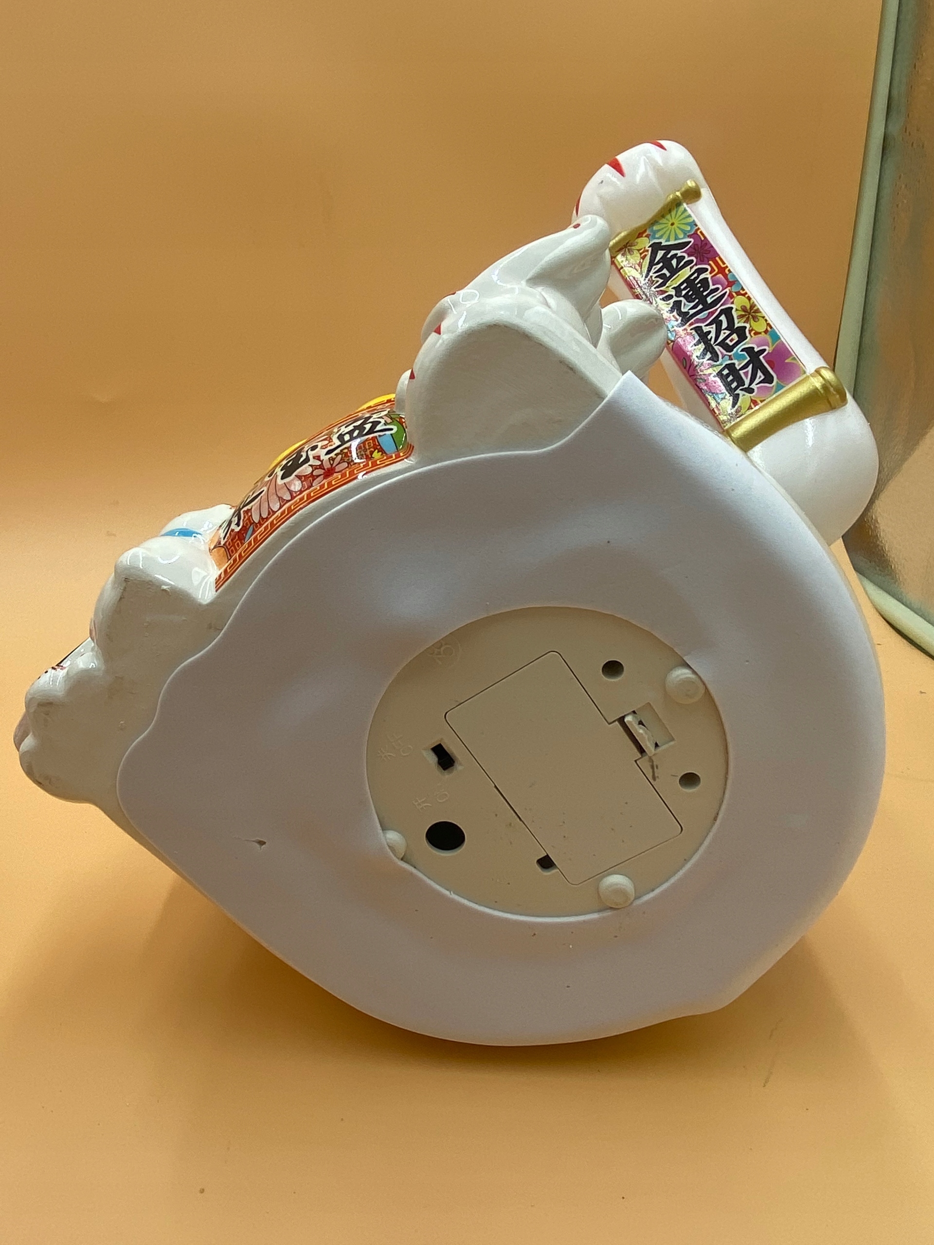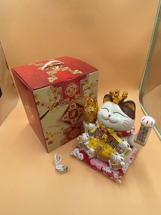 ОПИС - колір: золото, розміри (ширина/висота/товщина): 29/ 23/20 см, живлення: 2 батарейки АА 1,5 В (не входять в комплект) або блок живлення 230 В USB - входить в комплект, вага: 1550 г, в комплекті: котик, ящик, подушка, блок живлення.