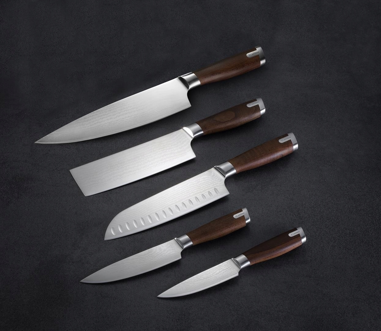 - Ножі серії DMS виробляються за допомогою технології плавлення 67 шарів, що з'єднує м'яку сталь VG2 та тверду сталь VG10. Завдяки цьому було досягнуто відмінні властивості - надзвичайна твердість, еластичність та довга міцність -