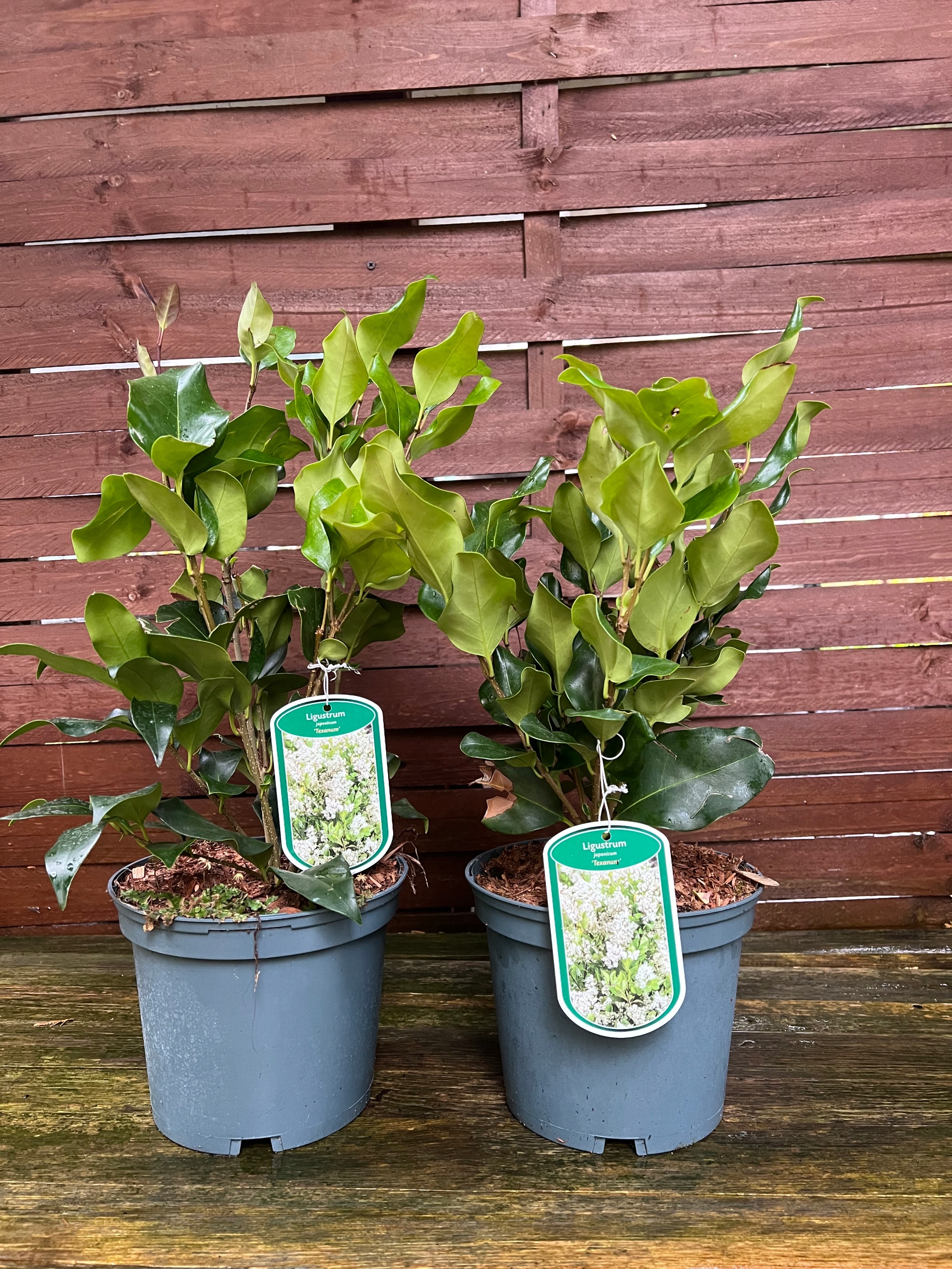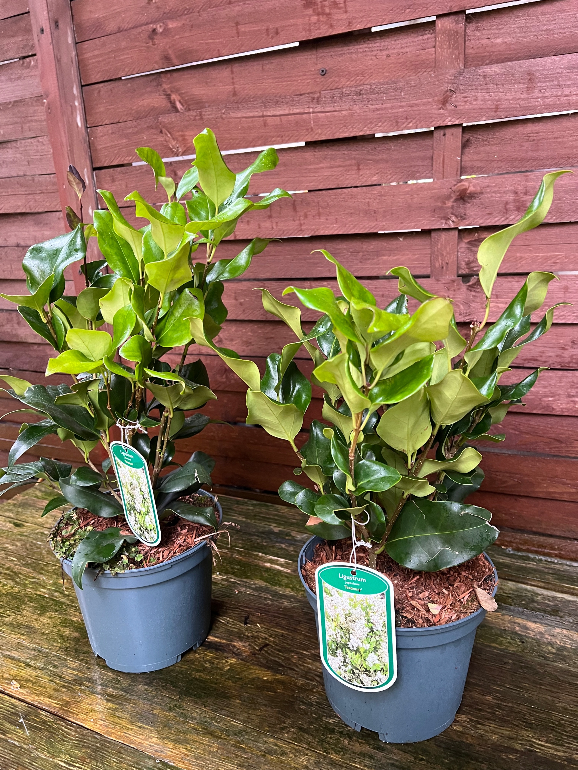 Ligustrum japonicum 'Texanum' (японська бирючина) – нижчий і повільніше зростаючий сорт японської бирючини, що досягає у висоту до 2,5 м, але зазвичай менший. Це вічнозелений, щільний, компактний кущ з товстим, округлим, восковим листям, блискучим зеленим зверху і більш блідим знизу. Наприкінці весни або на початку літа розпускаються запашні білі квіти, що приваблюють бджіл, а потім з’являються синьо-чорні ягоди. Висаджуйте на сонці або в легкій тіні і поливайте регулярно або час від часу. Стійкий до температур нижче -15°C. Він підходить як жива огорожа, його можна сформувати майже в будь-яку форму, і, як правило, вимагає дуже мало догляду. Однак будьте обережні під час зрізання, оскільки ножиці зрізають постійне, яскраве та видиме листя, тому краще зрізати вздовж стебла, а не зрізати, якщо рослини потрібно розглядати зблизька.