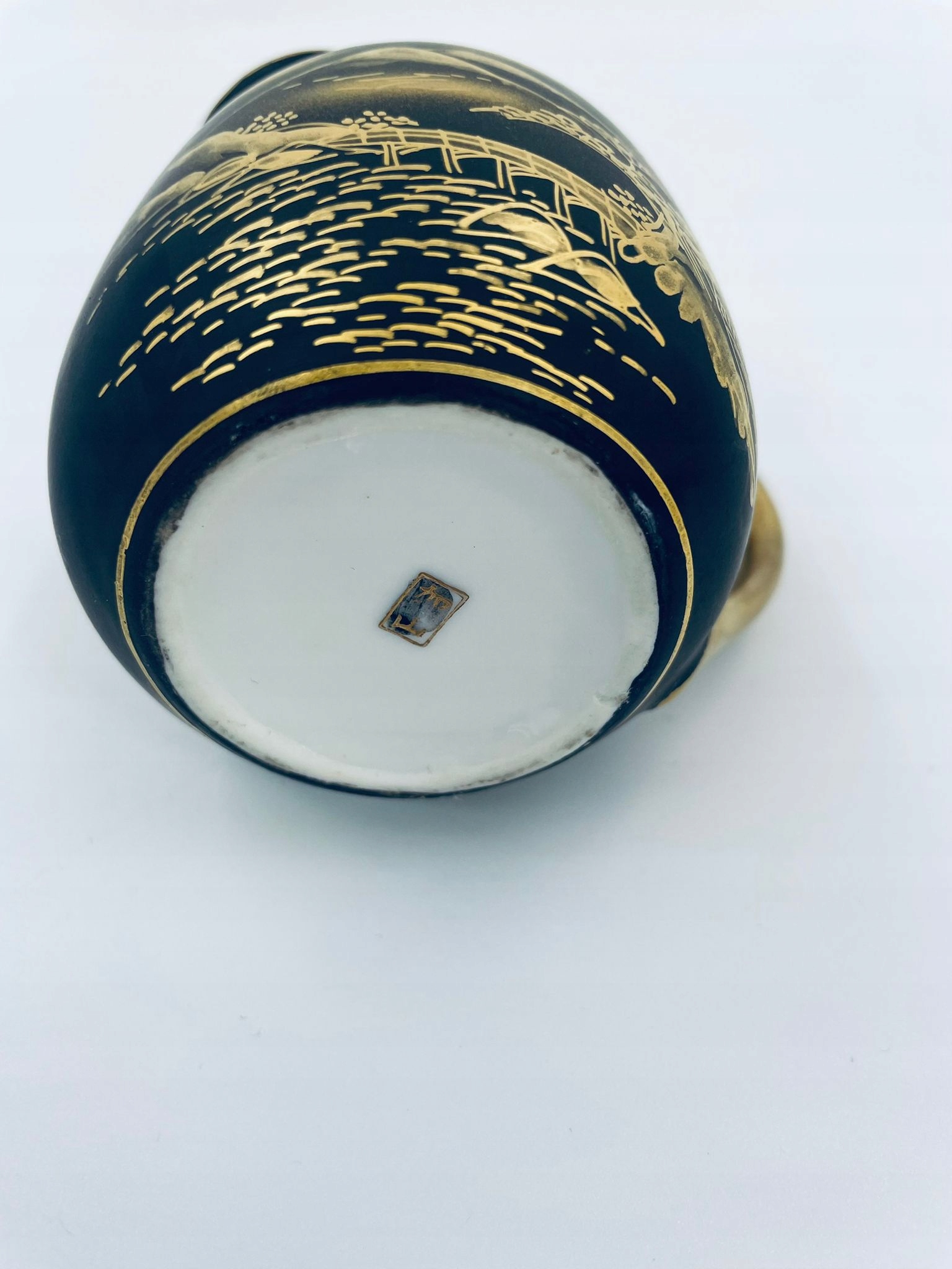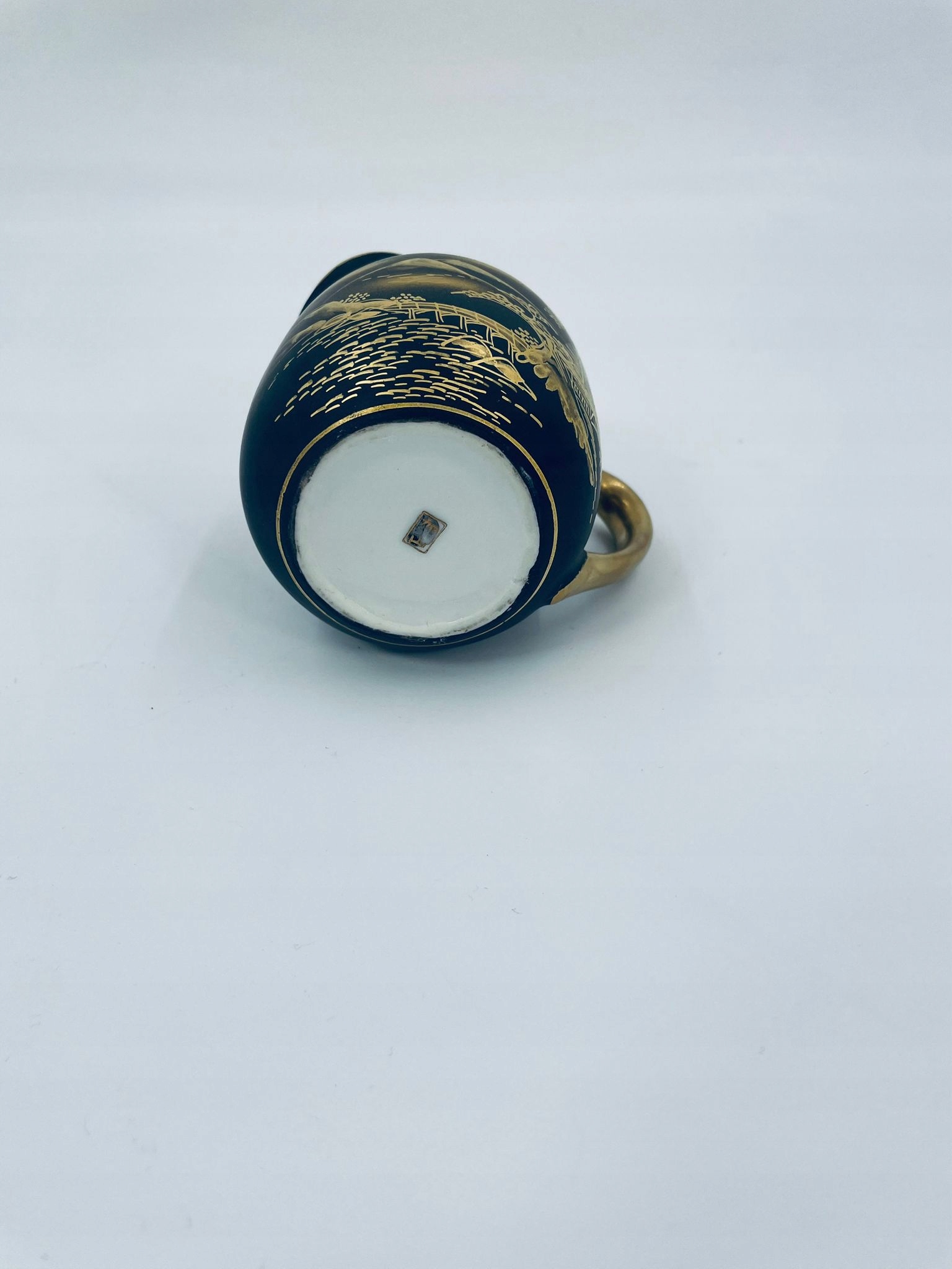 Японський молочник, виготовлений з високоякісної порцеляни. Молочна квітка, розписана вручну матово-чорним кольором із золотими прикрасами, що зображують краєвид гір, будівлю храму, дерева та міст. Золота ручка. Глечик із золотою смугою з візерунком у верхньому краї.