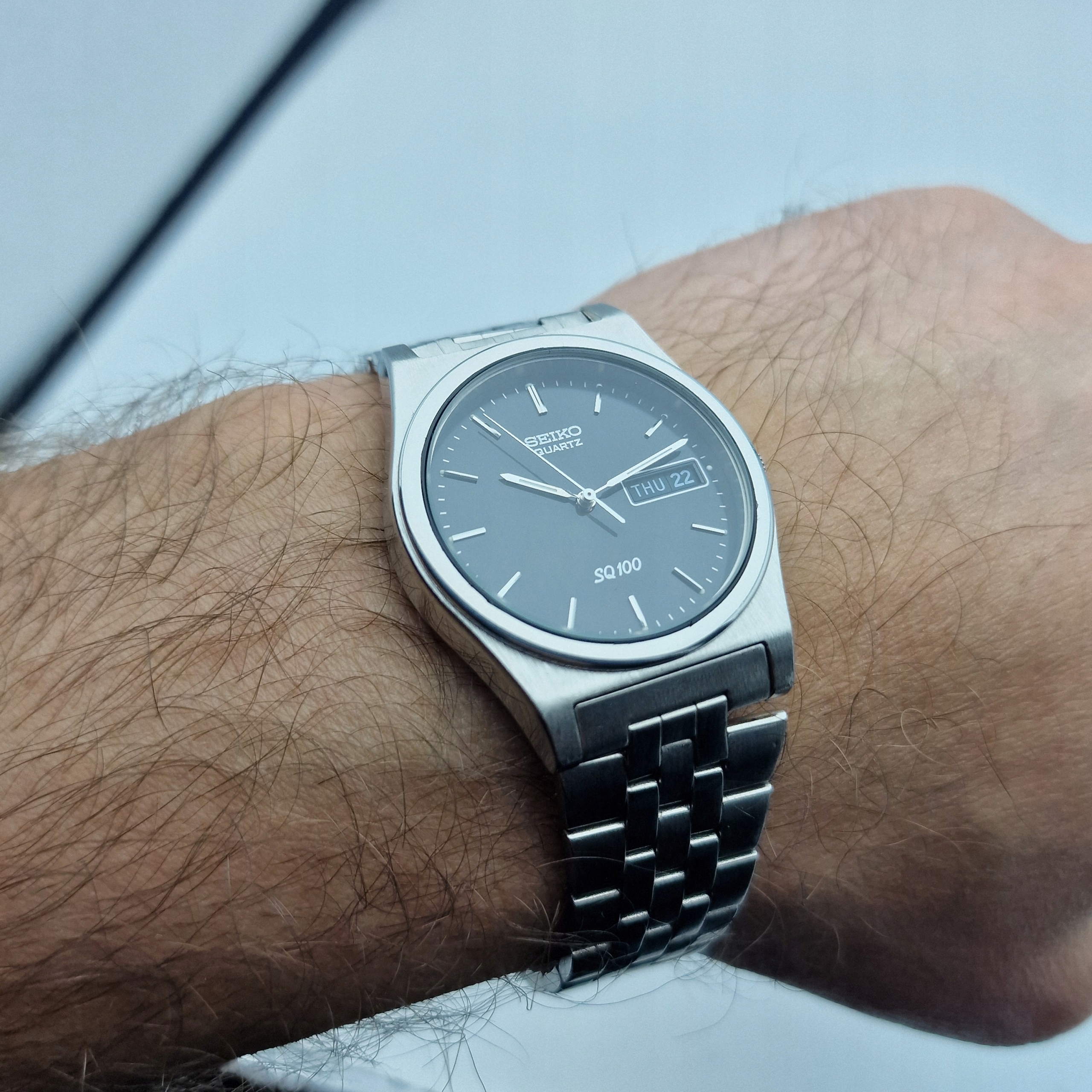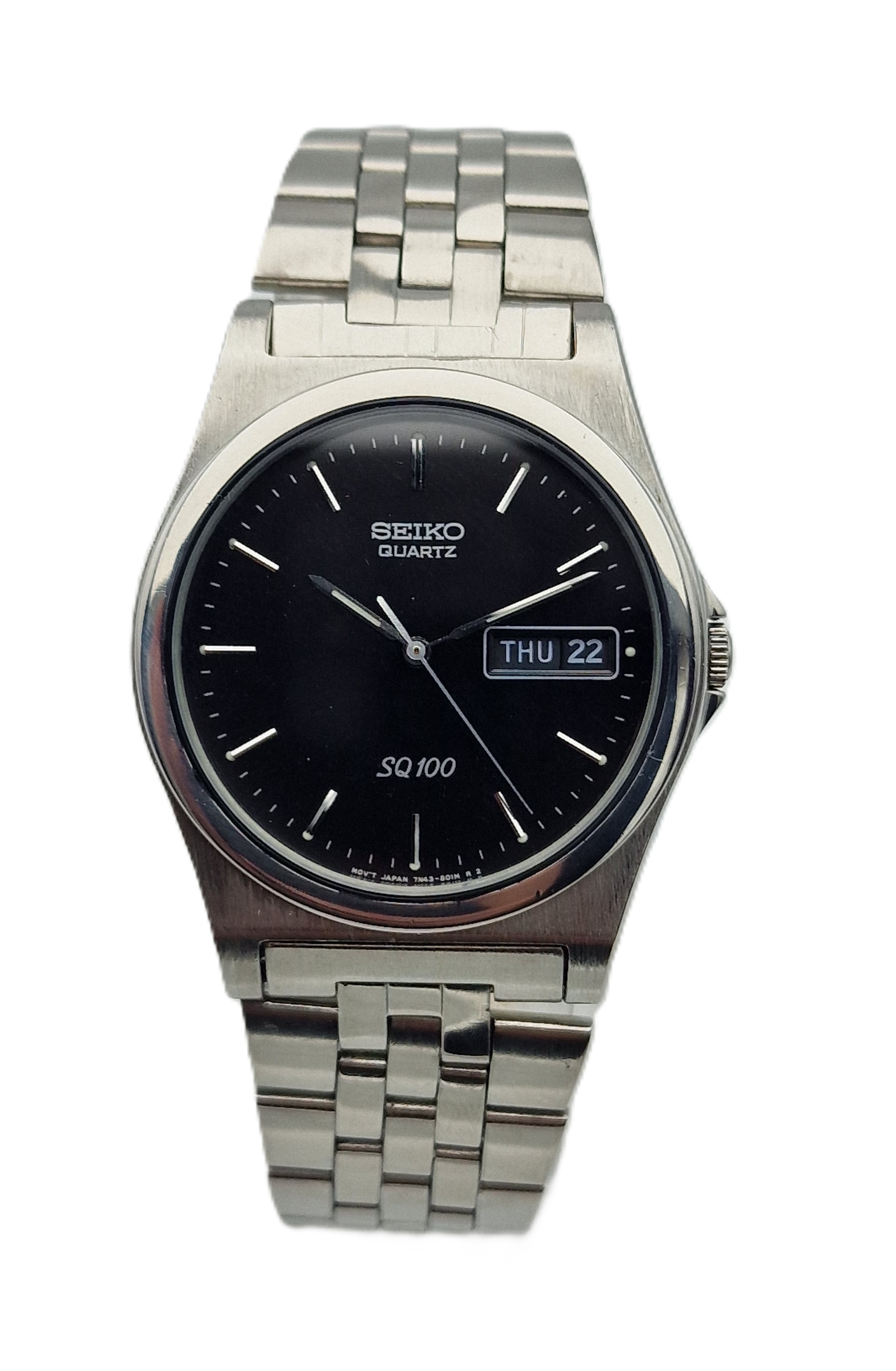 - Чорний циферблат зі срібними годинниковими мітками та датою на третій годині. Оригінальний циферблат із підписом: «SEIKO, QUARTZ, SQ100, JAPAN». Циферблат в ідеальному стані, на фото.