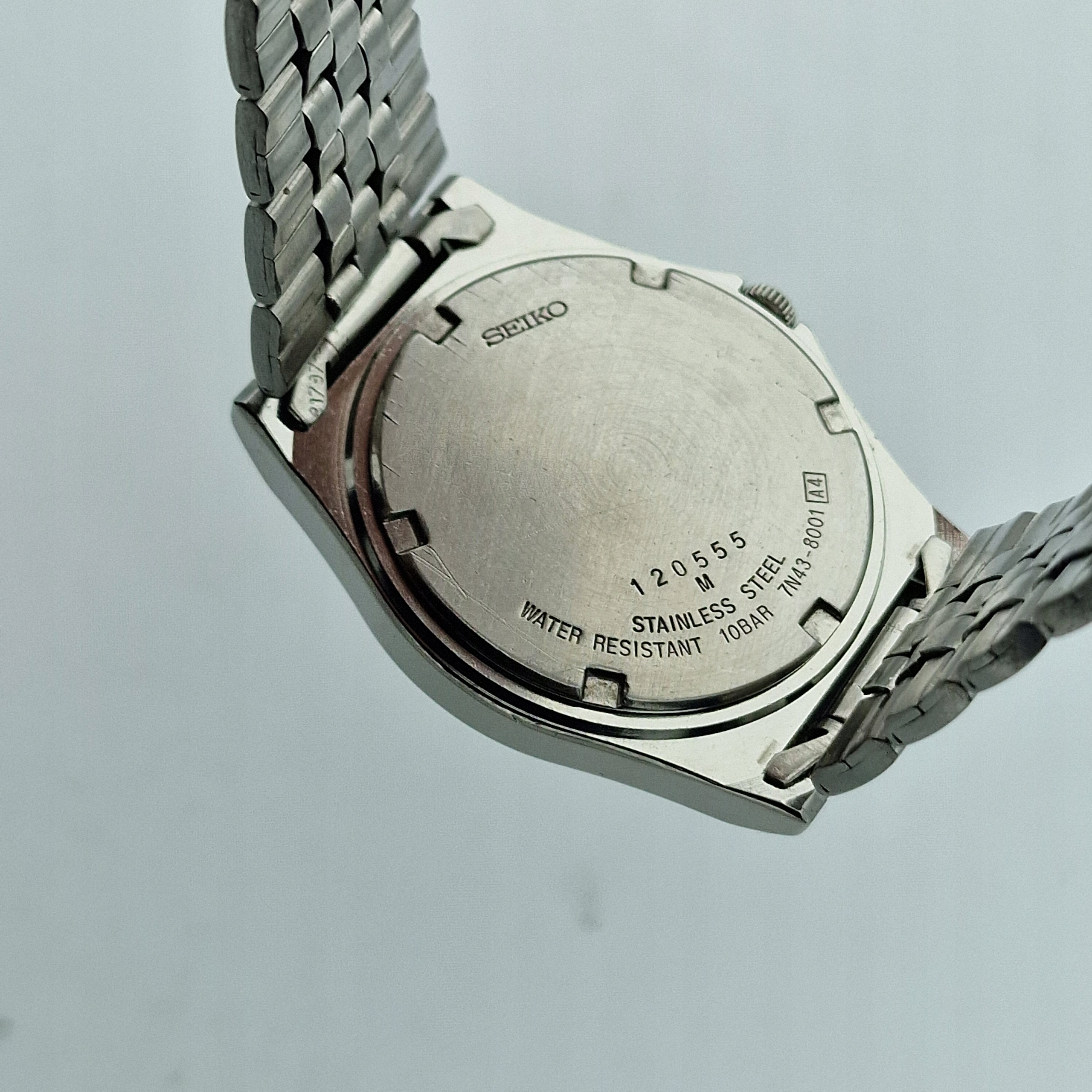 - Корпус повністю сталевий. Задня кришка, що загвинчується, із підписами: "SEIKO, ВОДОЗАЩИТА 10 БАР, НЕРЖАВІЮЧА СТАЛЬ". Оригінальне мереживо, в ідеальному стані. Корпус майже в ідеальному стані, як показано на фотографіях.