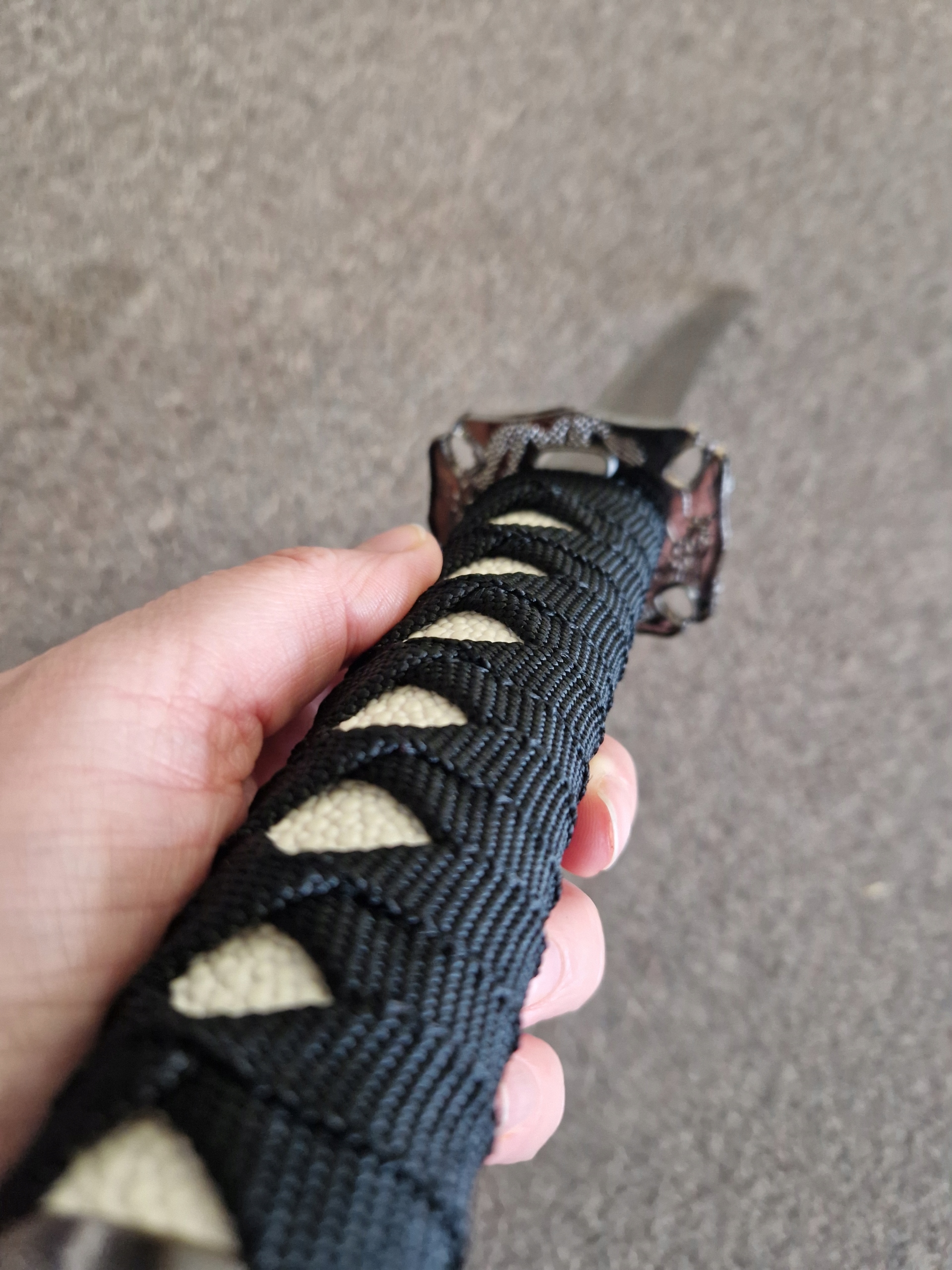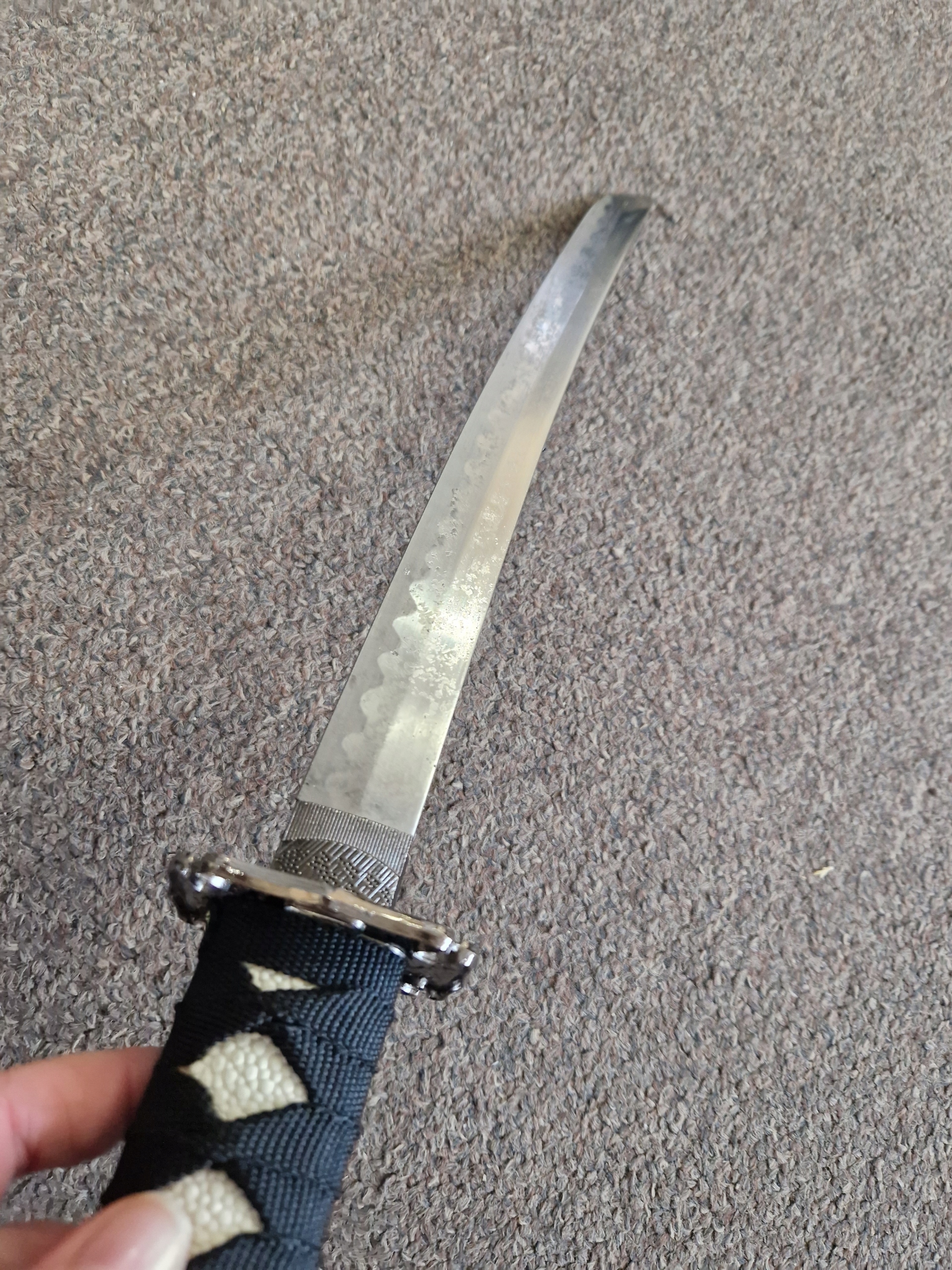 , але також практичні літери для букв . Виготовлений з високоякісної вуглецевої сталі , має трохи загострене лезо з характерним хамоном. Ручка, переплетена бавовняною мотузкою, імітацією шкіри ганчірки, забезпечує певне зчеплення. Дерев’яна піхва з прекрасним мотивом дракона додає кинджал елегантності та таємниці. Це ідеальне поєднання традиційного ремесла із сучасною функціональністю .