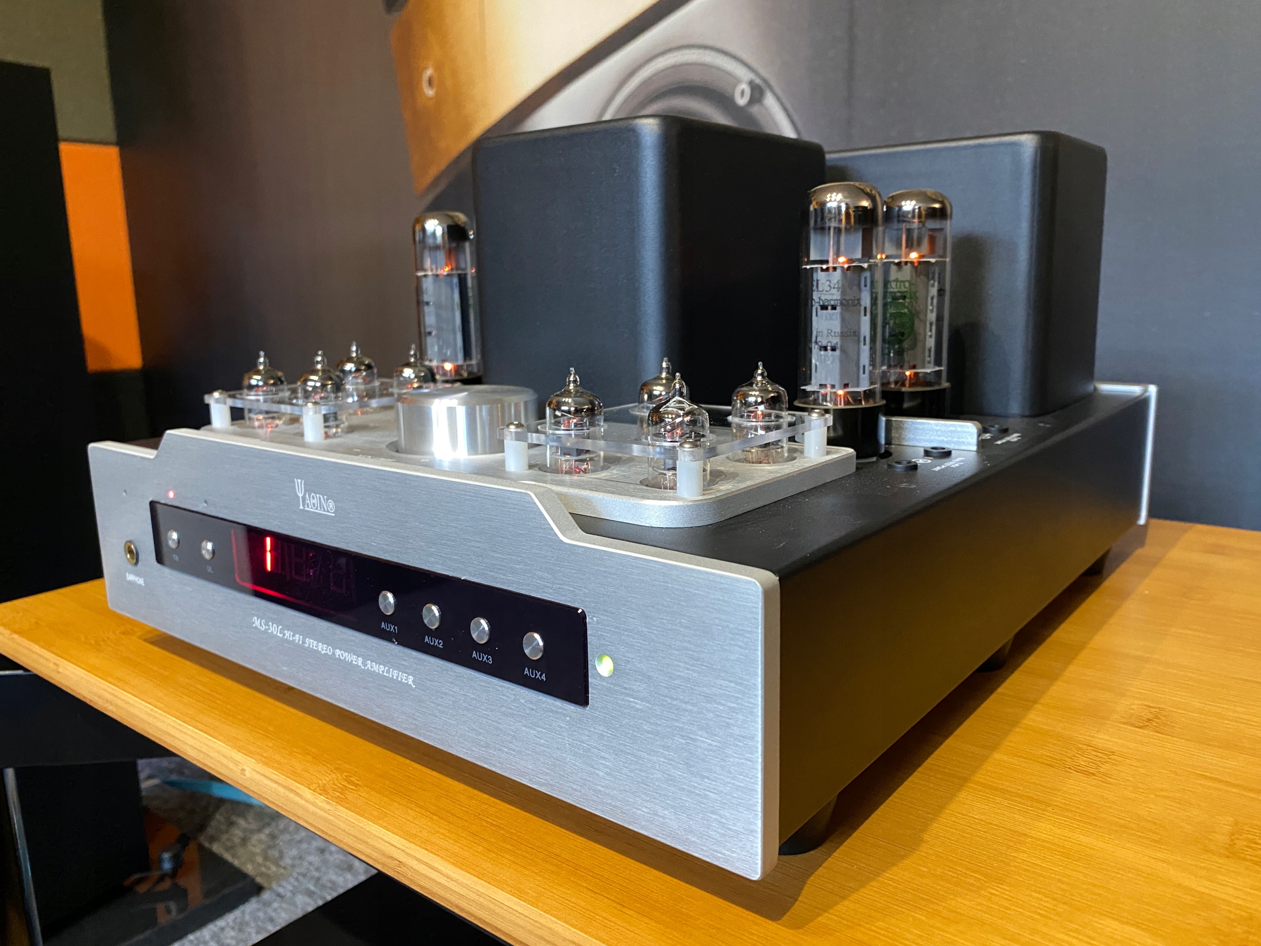 Підсилювач Yaqin MS-30L Це відремонтована версія підсилювача Yaqin MS-20L. Як і в попередній моделі, підсилювач працює в двотактній системі, яка заснована на тих же лампах, що і його попередник, тобто 2 лампи EL34-B на канал і 4 лампи драйвера 6J1 на канал. Така конструкція дозволяє працювати в двох режимах: тріодному і ультралінійному - пентодному (вибір управління з передньої панелі або пульта). Підсилювач має вихід для навушників, розташований на передній панелі.