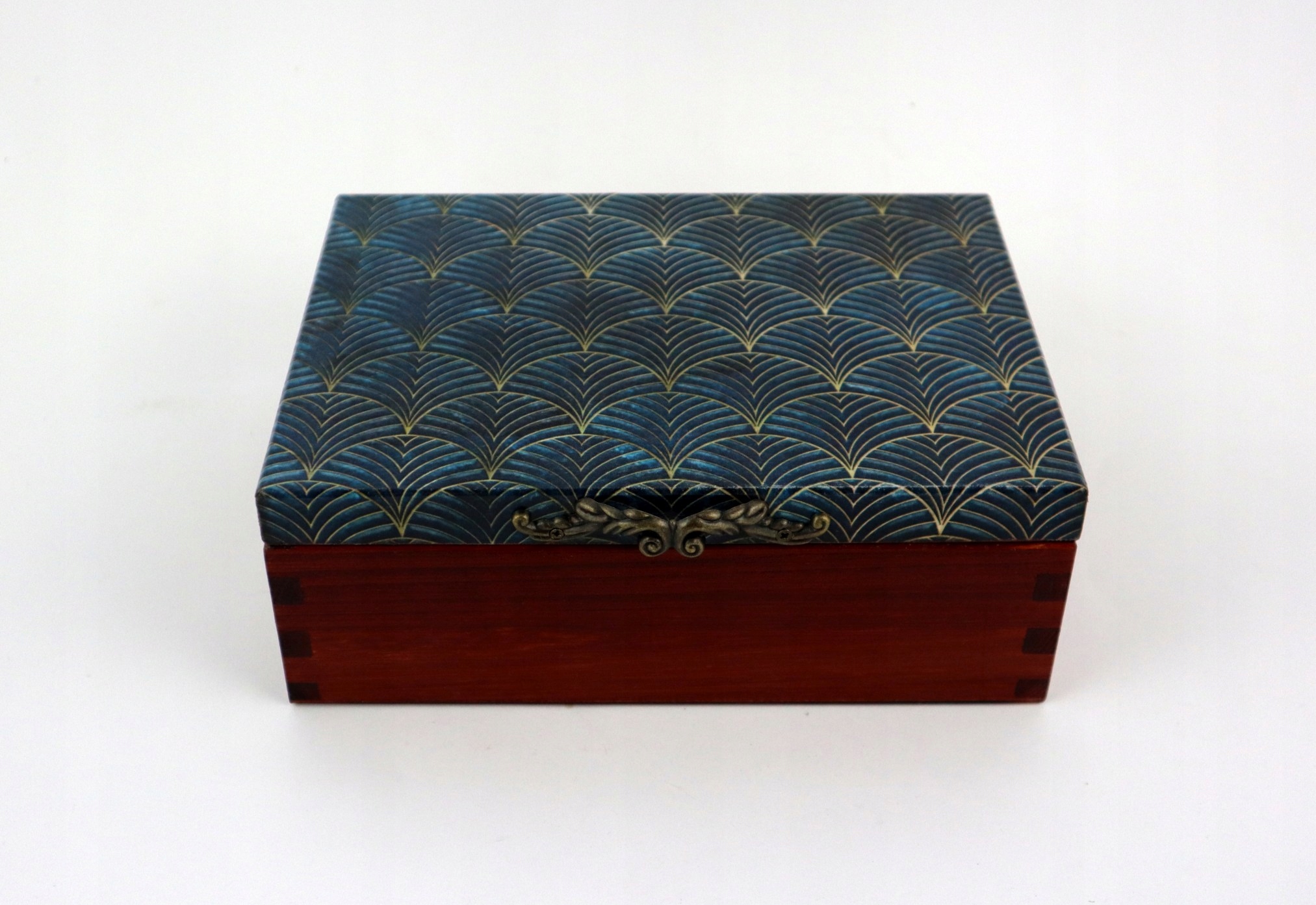 Ця скринька виконана в глибокому відтінку Palisander, що надає їй неповторного шарму та елегантності. Кришка коробки має візерунок із золотих віял на темно-синьому тлі. Таке поєднання кольорів і візерунків створює атмосферу розкоші та класу.
