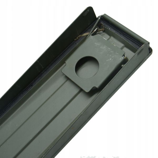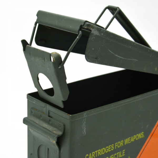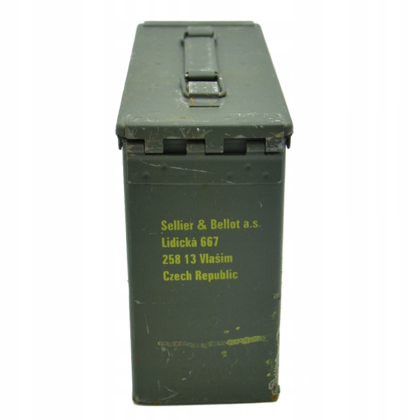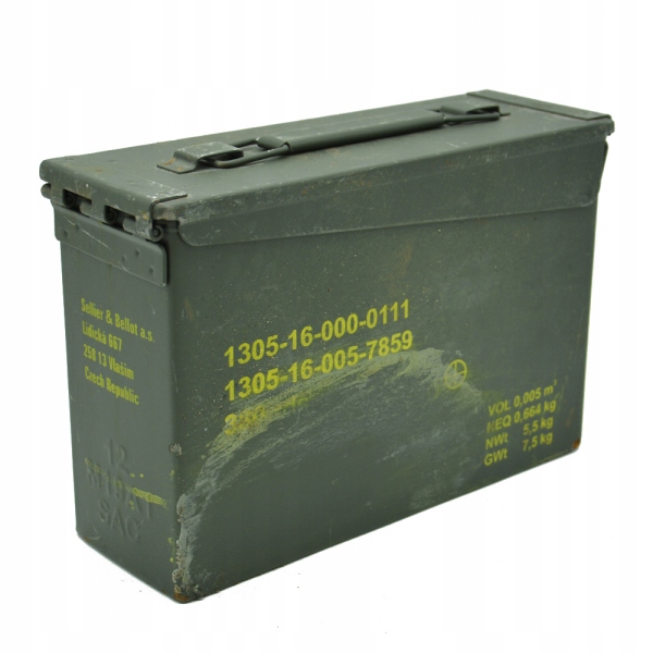 Ящик для боєприпасів, який використовується для транспортування та зберігання боєприпасів. Ящики прямокутної форми виготовлені з металу з високою стійкістю до навантажень і деформацій. Ящики пофарбовані зеленою фарбою, яка не відбиває ІЧ-промені та захищає метал від корозії. На верхньому клапані є складна ручка для транспортування. Вони закриваються надійною та довговічною застібкою, яка завдяки ущільненню в кришці захищає внутрішню частину від проникнення пилу або води. Вони відповідають стандартам НАТО.