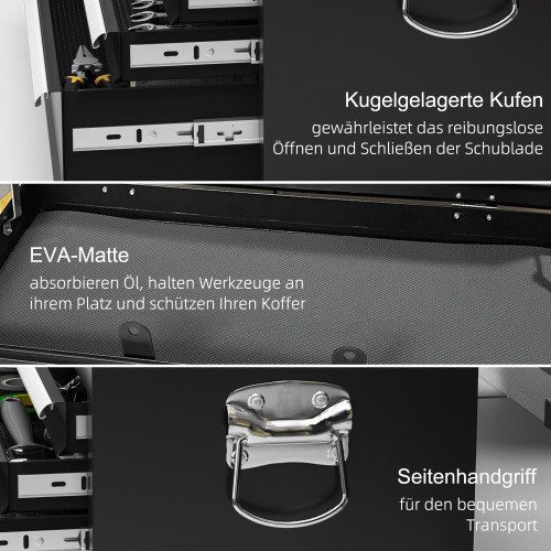 Надійне рішення для зберігання: цей ящик для інструментів має шість висувних шухляд і відсік для зберігання вгорі, що дає змогу зберігати різноманітні інструменти впорядкованими та легкодоступними. Направляючі шухляд на кулькових підшипниках забезпечують плавне відкривання та закривання.