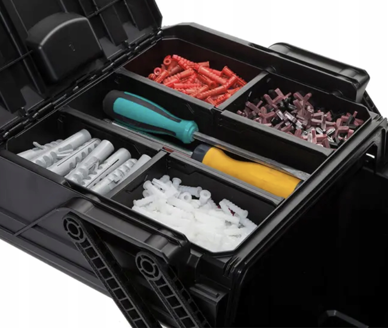- Практичний внутрішній поділ: Внутрішній органайзер полегшує розділення менших елементів, таких як болти, шурупи чи ручні інструменти.