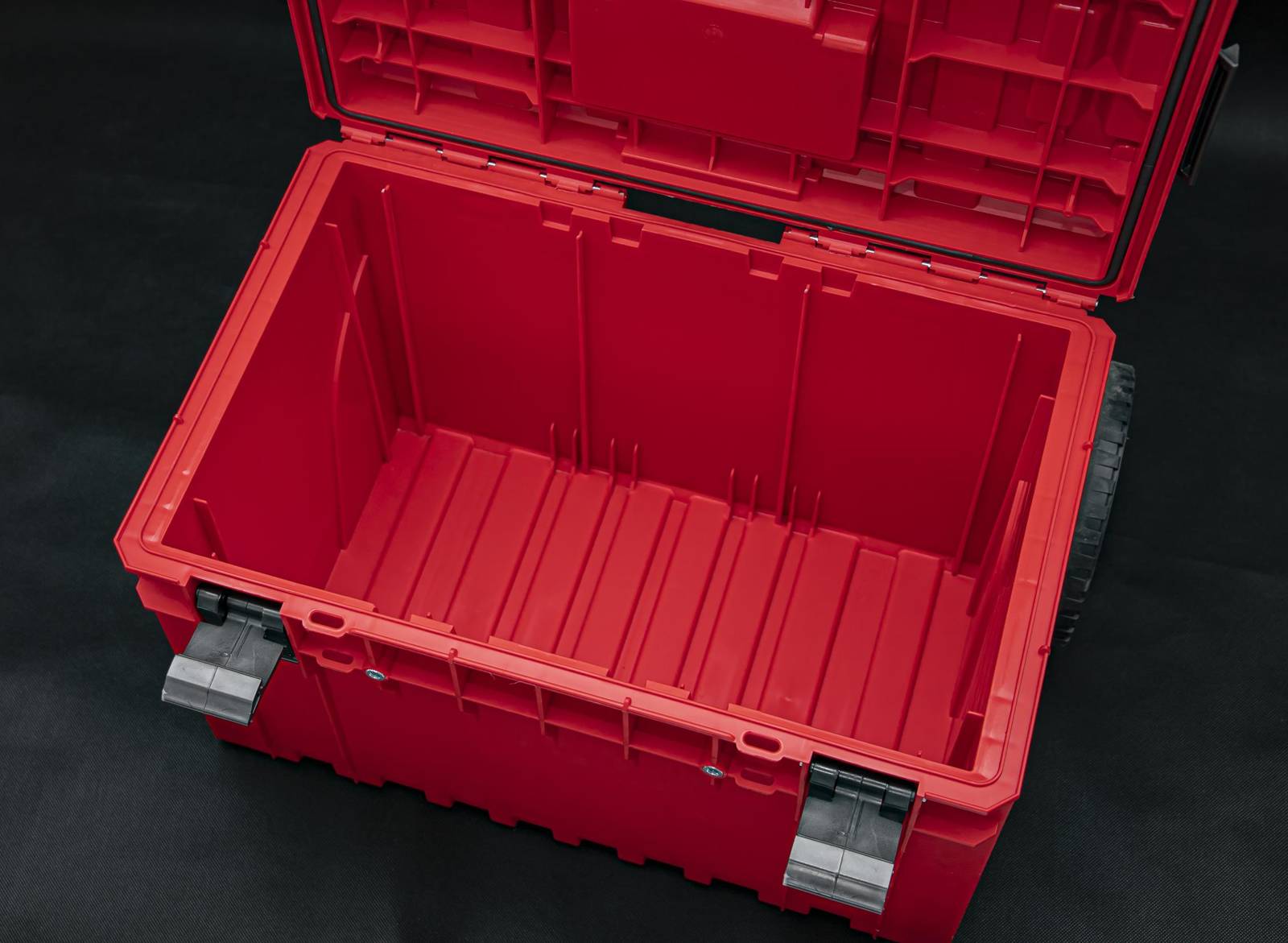 QS ONE Cart RED Ultra HD — це мобільний ящик для інструментів із великим місткість оснащена великими колесами, встановленими на металеву вісь. Оснащений телескопічною ручкою з анодованого алюмінію. Для кращої організації інтер'єру ящик оснащений двома лотками і двома відділеннями.