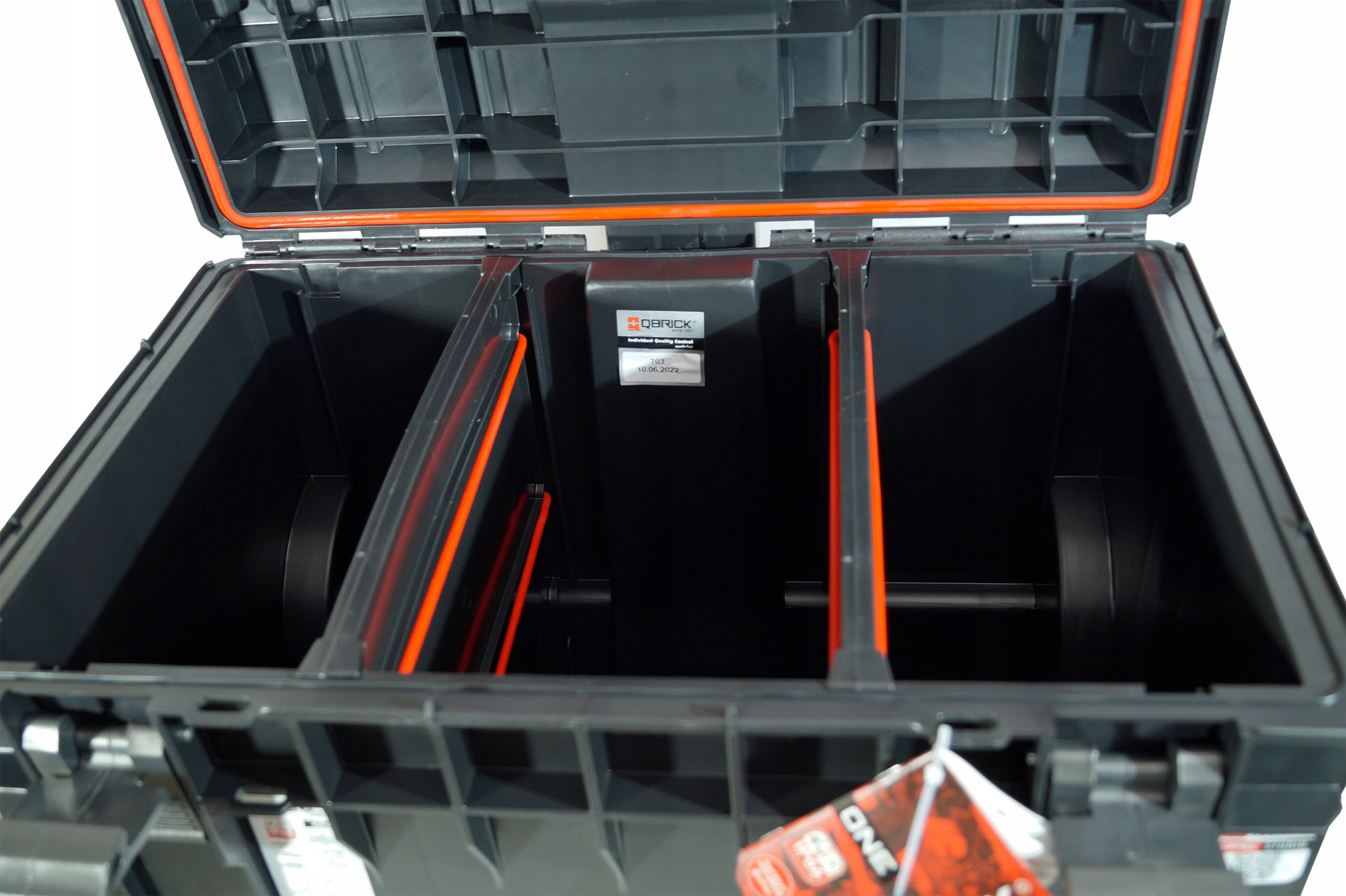 Його вантажопідйомність становить максимум 50 кг і він стійкий до перевантажень до 120 кг. Qbrick System One водонепроникний і пилонепроникний. Великі електроінструменти можна транспортувати в коробках System One.