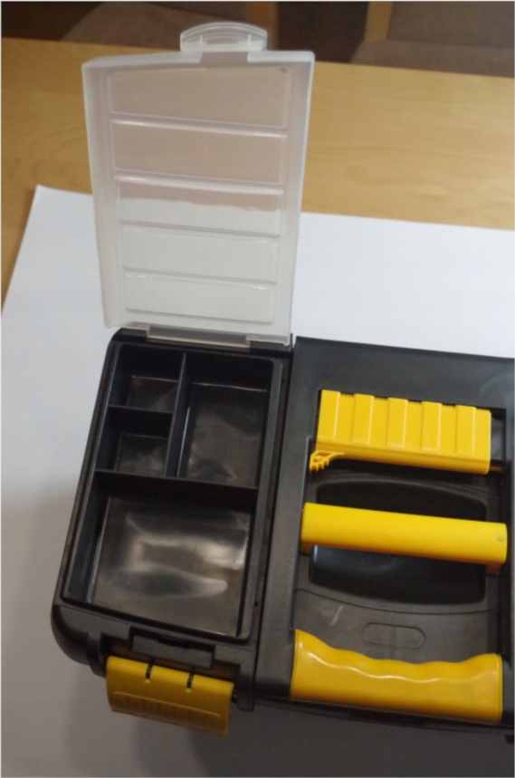 - Валіза розділена на 2 частини: верхня валіза зі знімною полицею та нижня велика валіза для електроінструментів.