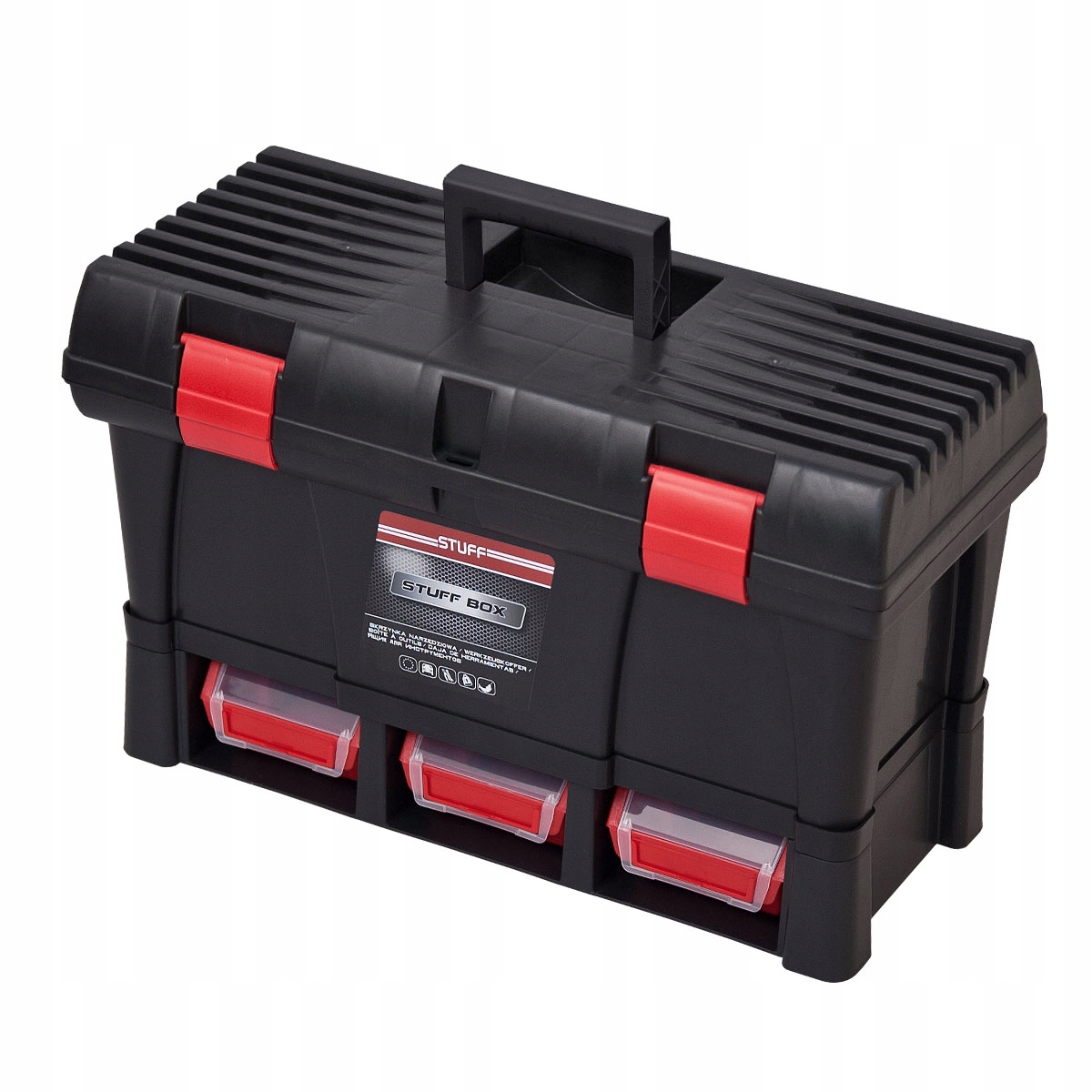 Модуль Optimo B System — це ящик, призначений для транспортування та зберігання інструментів. Це корисно для всіх ентузіастів домашнього DIY та професіоналів, які цінують порядок у своєму ящику з інструментами. Він оснащений ручкою для зручного транспортування інструментів і пластиковим підносом для зберігання невеликих предметів, напр. нігті. Він також оснащений трьома червоними ергобоксами, які розміщуються в отворах валізи. Алюмінієві затискачі та місце для замка запобігають крадіжці інструменту.