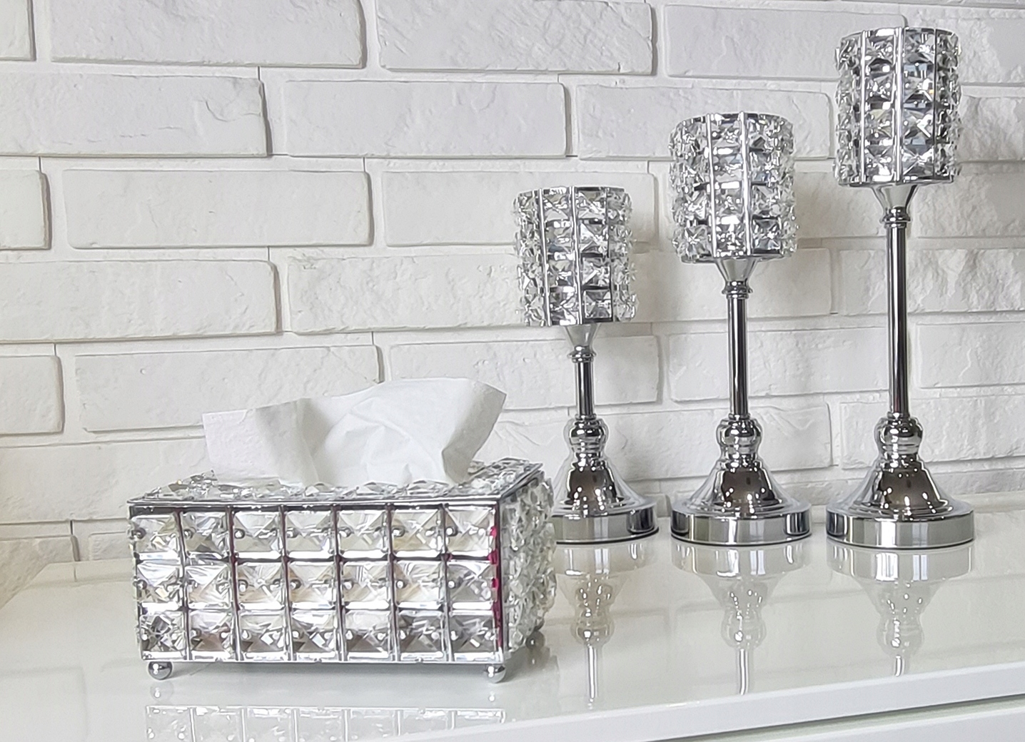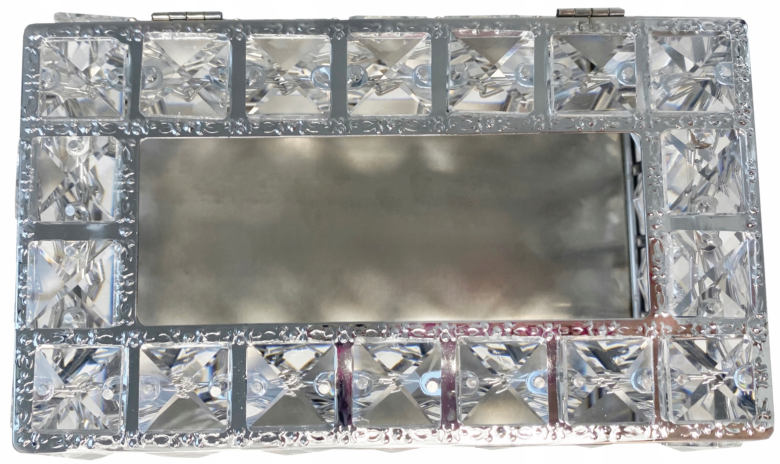 Коробка для серветок із кристалами з боків і зверху. Дно контейнера металеве, оброблене чотирма круглими підніжками. Отвір прямокутний.