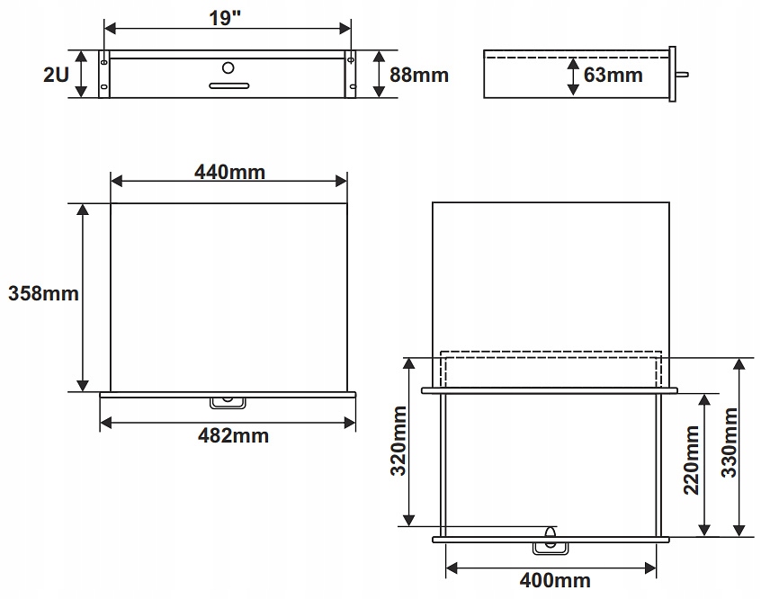 - Розміри: 400 x 63 x 330 мм - внутрішні розміри 482 x 88 x 360 мм - зовнішні розміри