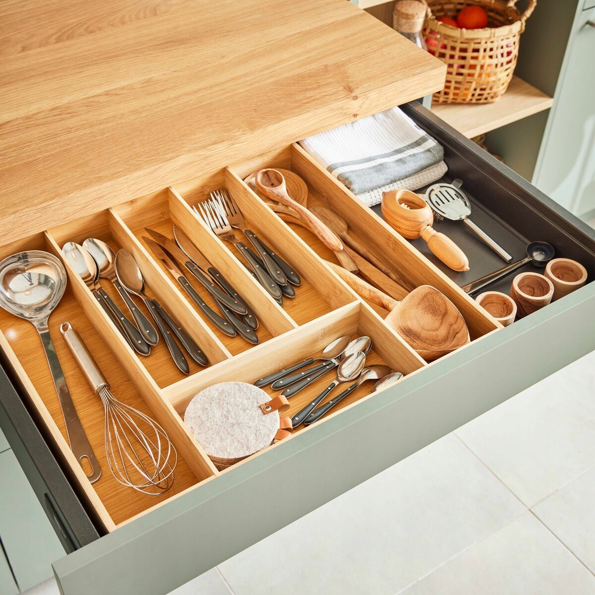 Вставка ящиків Delinia - це функціональне рішення, яке допоможе вам організувати простір у кухонних ящиках. Його дизайн складається з декількох камер, які дозволяють впорядкувати різні предмети, такі як столові прибори, ножі, кухонний начин та аксесуари. Зроблений з бамбука, картридж не тільки додає природному шармі вашій кухні, але й міцний і простий в очищенні. Вставка допомагає підтримувати порядок та організацію в ящиках, що полегшує щоденне використання кухні. Вставка ящиків Delinia - це не лише практичне рішення, але й естетичний елемент, який збільшує зовнішній вигляд вашої кухні. Його природна краса та функціональність роблять це чудовим вибором для тих, хто цінує порядок та витонченість у своєму кухонному просторі.