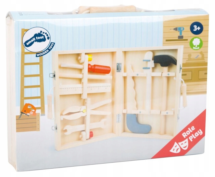 Дерев'яний набір з інструментами від відомого виробника іграшок Small Foot Degisn — ідеальний набір для найменших любителів саморобки. Просто беріть свою валізу і йдіть. Будь-які дефекти або дрібні ремонти не стануть проблемою з таким асортиментом під рукою :)