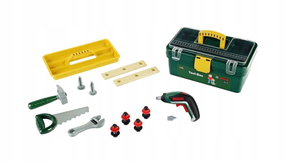 Коробка темно-зеленого кольору, має жовту ручку та прозору кришку, що відкривається, завдяки чому дитина може легко побачити, що всередині, не відкриваючи її. Всередині є жовтий лоток з ручкою, який полегшує гру в саморобку, оскільки на ньому можна розмістити дрібні елементи, наприклад гвинти з набору. У набір також входить пила і молоток з темно-зеленими ручками, гайковий ключ і акумуляторна викрутка Bosch Ixiolino II. Викрутка міцно вставлена