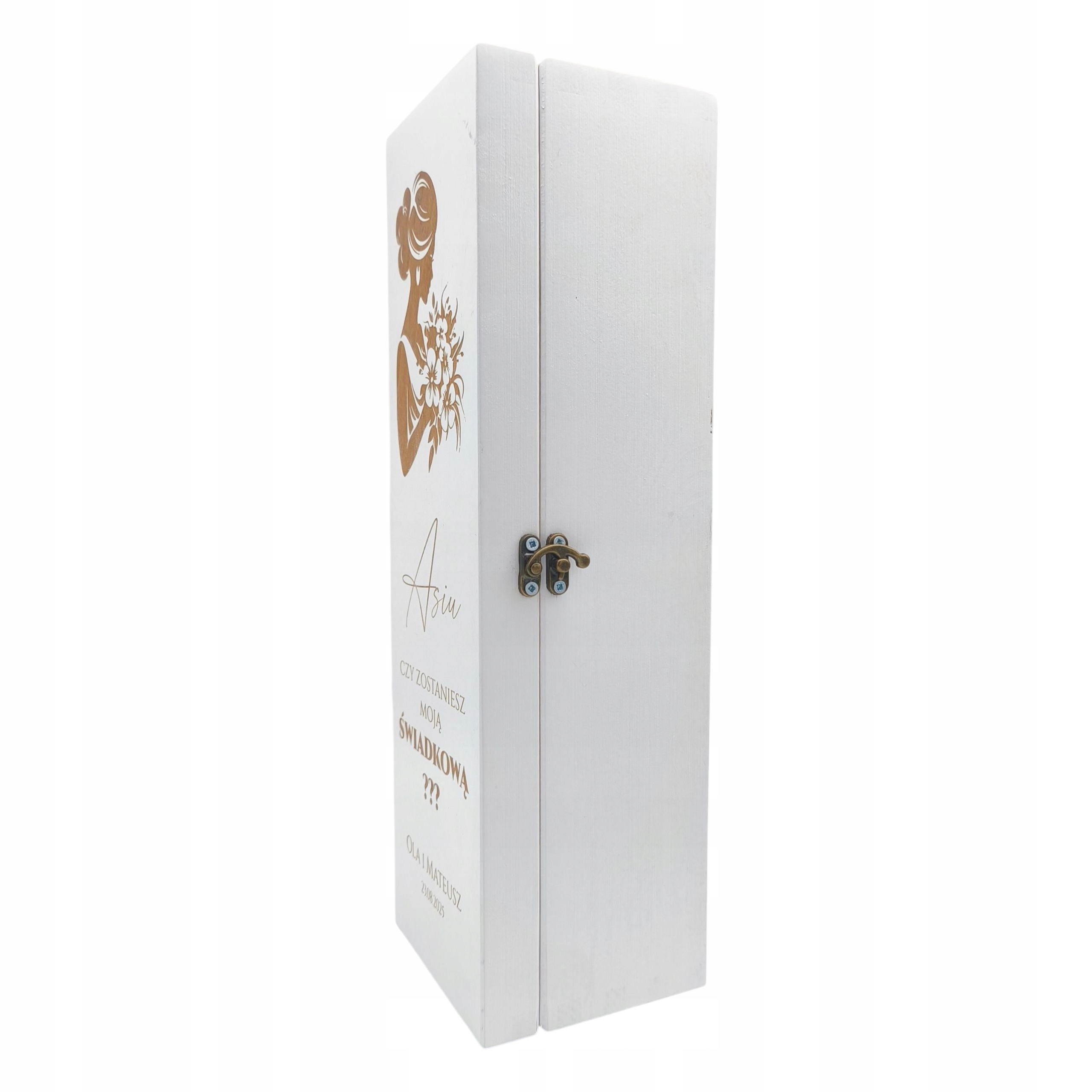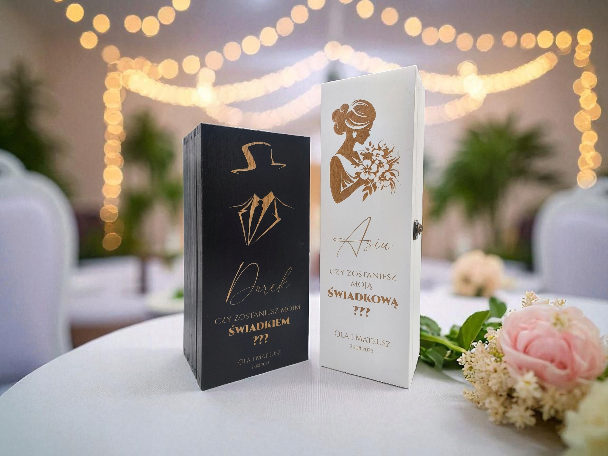 Кожна коробка прикрашена елегантним друком із вмістом "Чи станеш ти моїм свідком?" Або "Чи станеш ти моїм свідком?", І головне - це може бути персоналізоване за ім'ям людини, дата, ознаки нареченого та нареченої чи відданості, що робить цей подарунок ще більш унікальним та особистим.