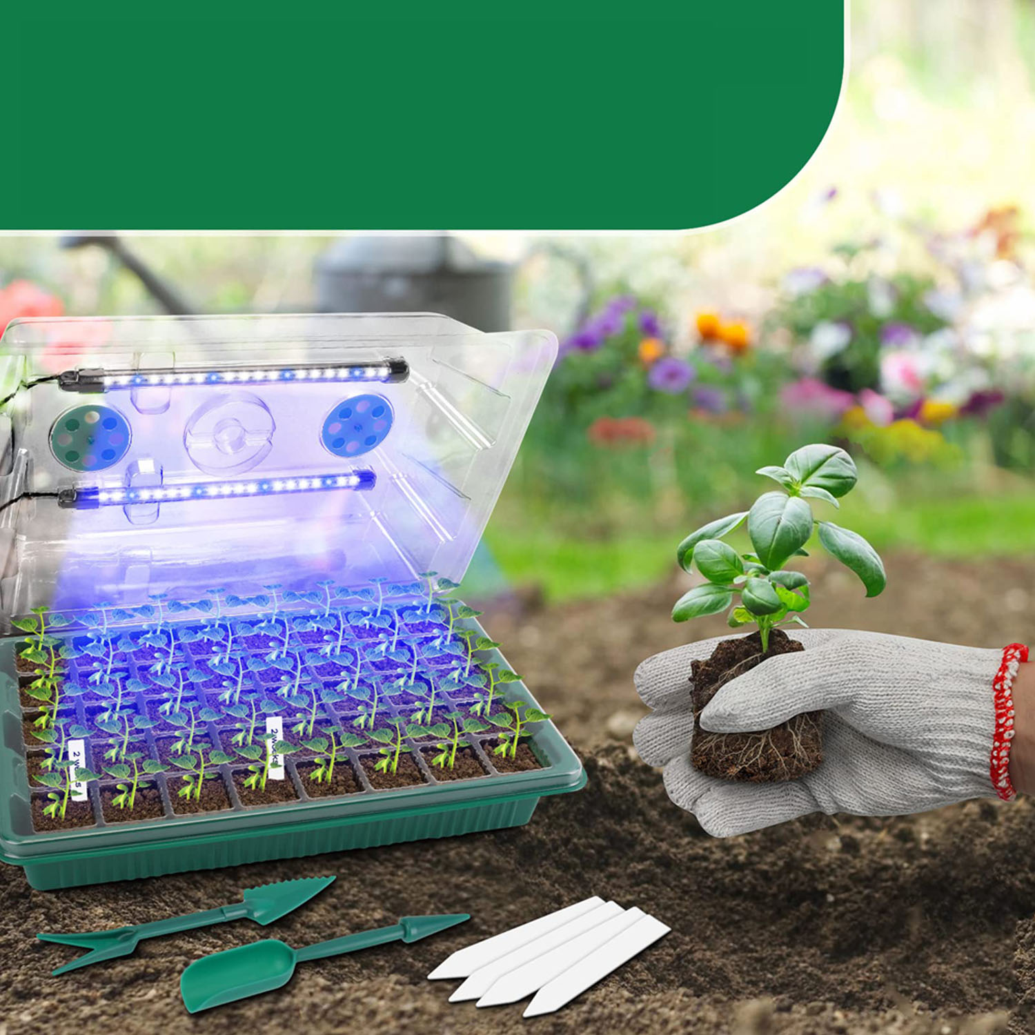 - Цей піддон для посадки насіння з освітленням забезпечує чудові умови для вирощування різноманітних рослин, зокрема квітів, овочів, фруктів, помідорів тощо. Ви можете навчитися вирощувати рослини вдома разом із сім’єю. Спостерігайте, як ваші рослини ростуть щодня за допомогою цієї сучасної стрічки для посадки садового насіння!