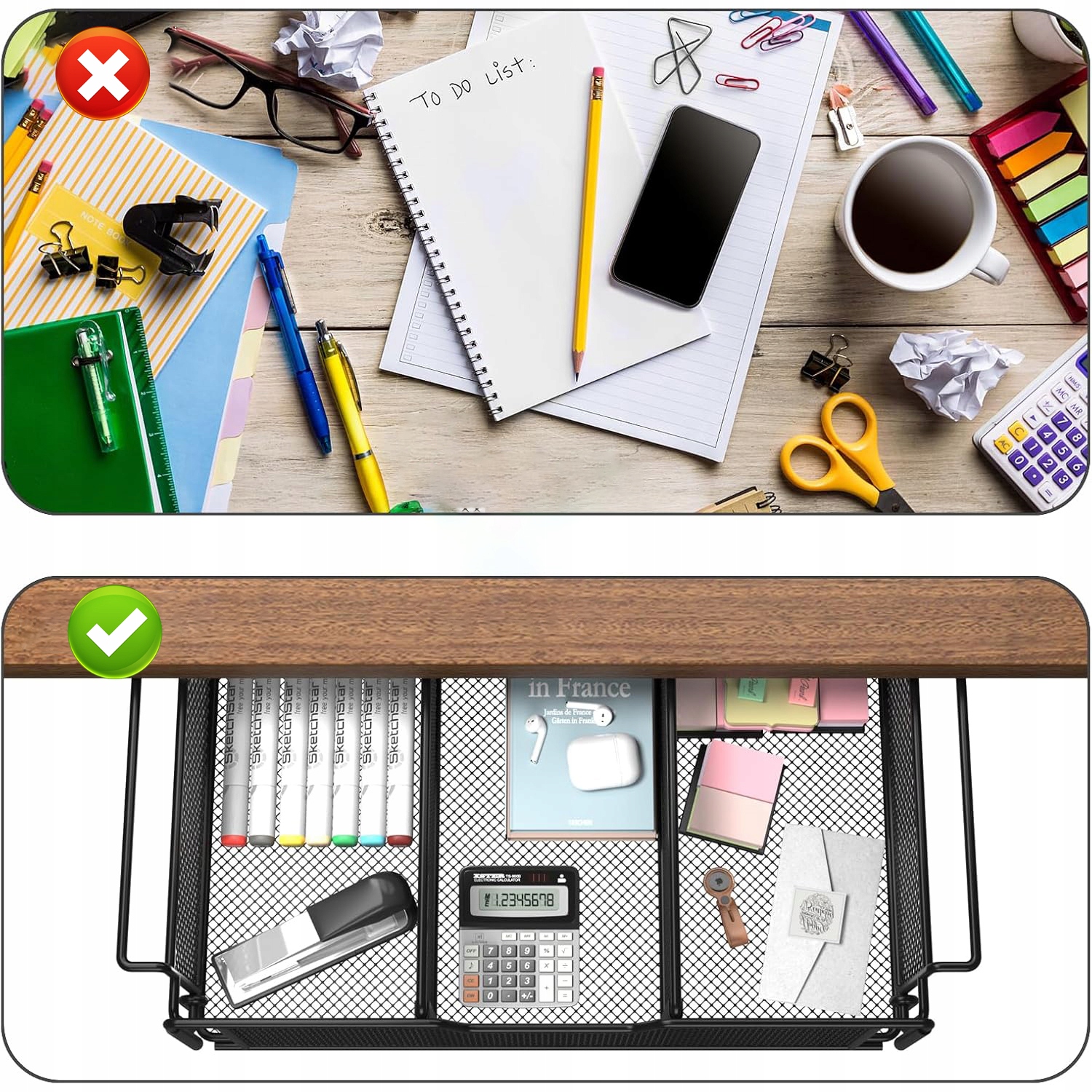 ➡ Ідеальний організатор ящика під столом : Організатор прихованого столу - це висувна шухляда. Він зберігає офісні товари з точки зору та допомагає швидко визначити вміст кожного відділення, що значно підвищує вашу продуктивність. Ви можете встановити його під столом, випускаючи простір на столі і роблячи його менш захаращеним.
