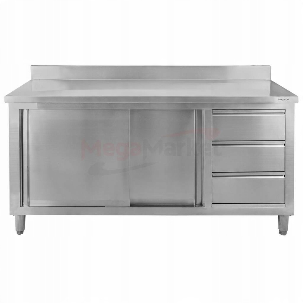 Стіл робочий Мега-М > дозволяє зручно готувати страви, а також зберігати різноманітні приналежності, завдяки тому, що під стільницею обладнано шафою з розсувними дверцятами та трьома місткими ящиками.
