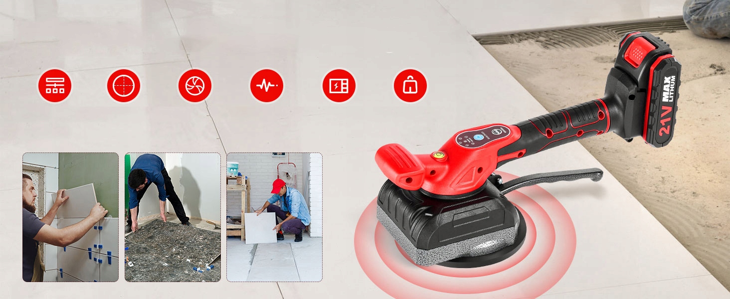 , виготовлені з високоякісної пластику ABS, сплаву та гуми, характеризується високою твердістю, високою вантажопідйомністю, стійкістю до зносу та міцністю, що робить його придатним для широкого спектру стін та керамічної плитки. Вібратор також оснащений двома літієвими акумуляторами потужністю 1500 мАг.