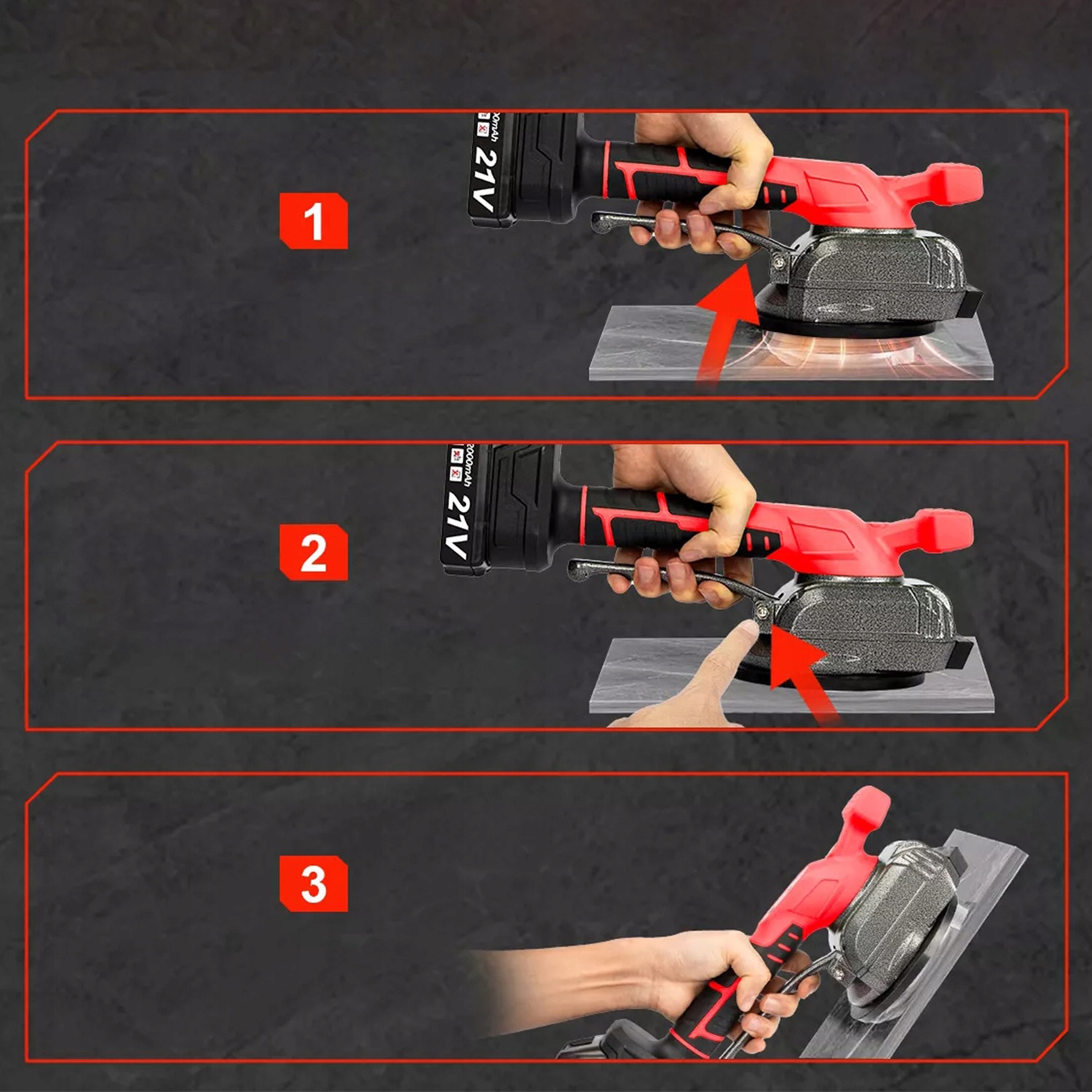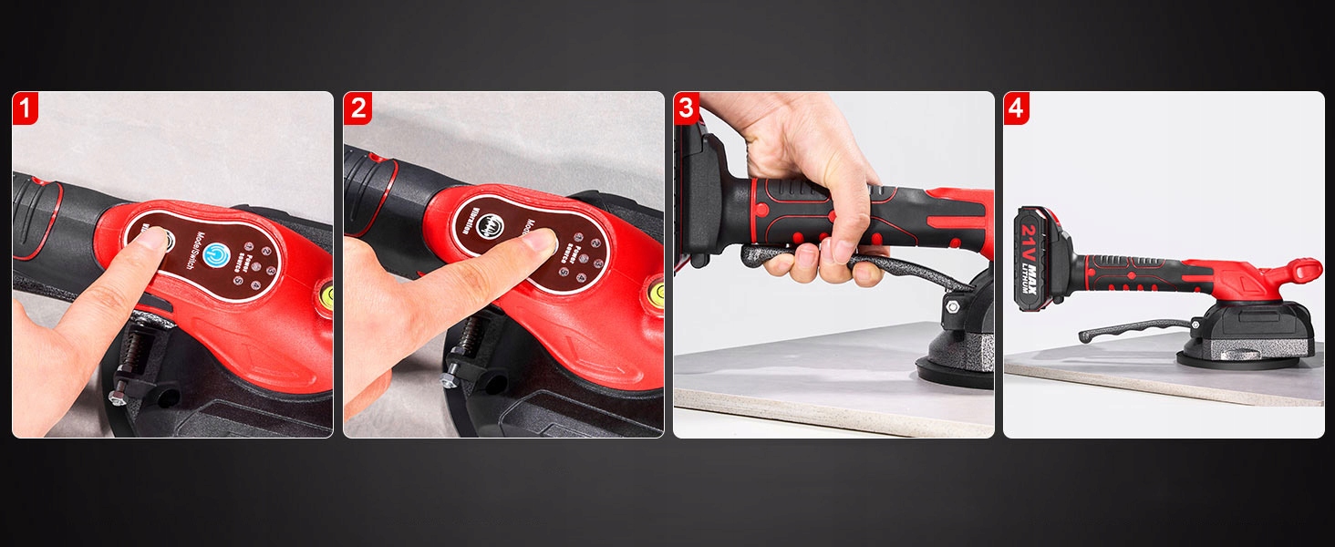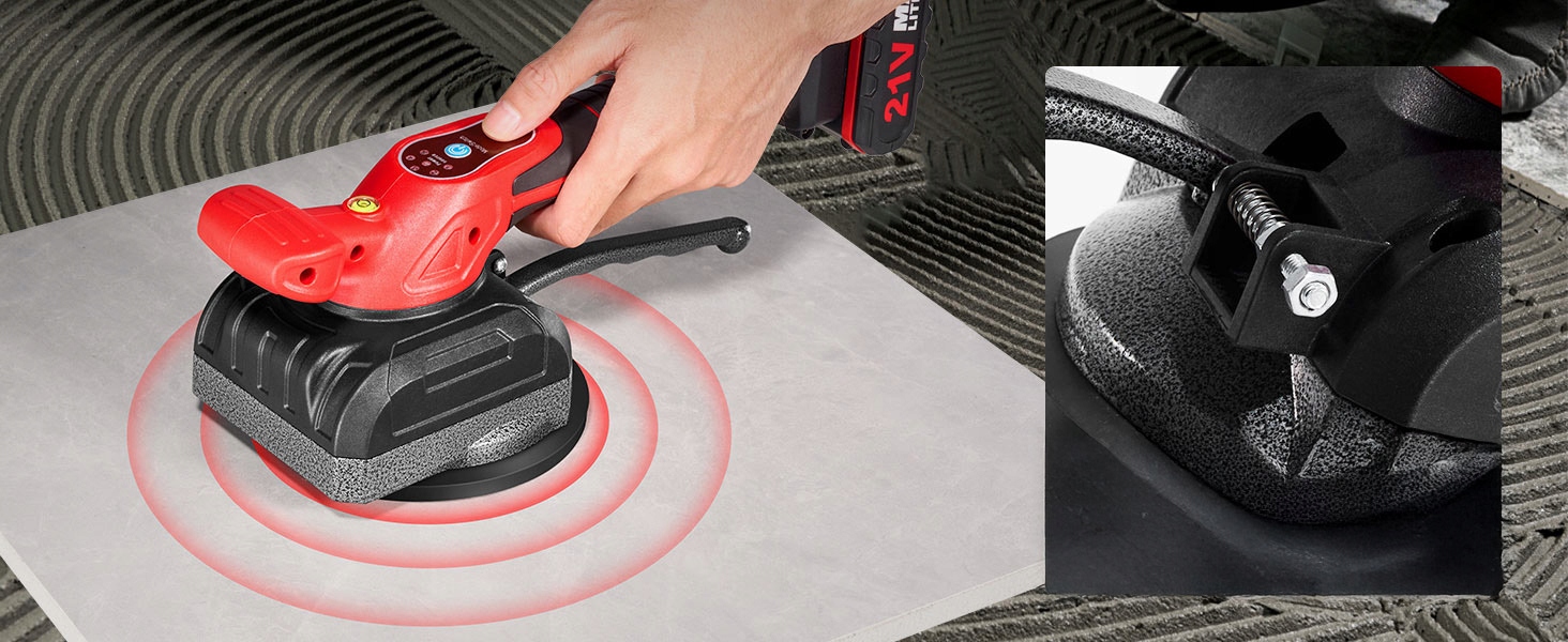 Розтягування замок вперед активізує режим смоктання вібратора, не тримаючи плитки та підтримуючи ручку всмоктування. Вам не потрібно стиснути ручку, що запобігає випадковому падінню плитки. Порівняно з традиційними моделями рук, це зменшує біль у руці і зручніше у використанні. Освітлений РК -дисплей вказує на рівень вібрації і може бути відрегульований, якщо це необхідно. Унікальна форма подвійних ручок забезпечує баланс під час підйому та закладання плитки.