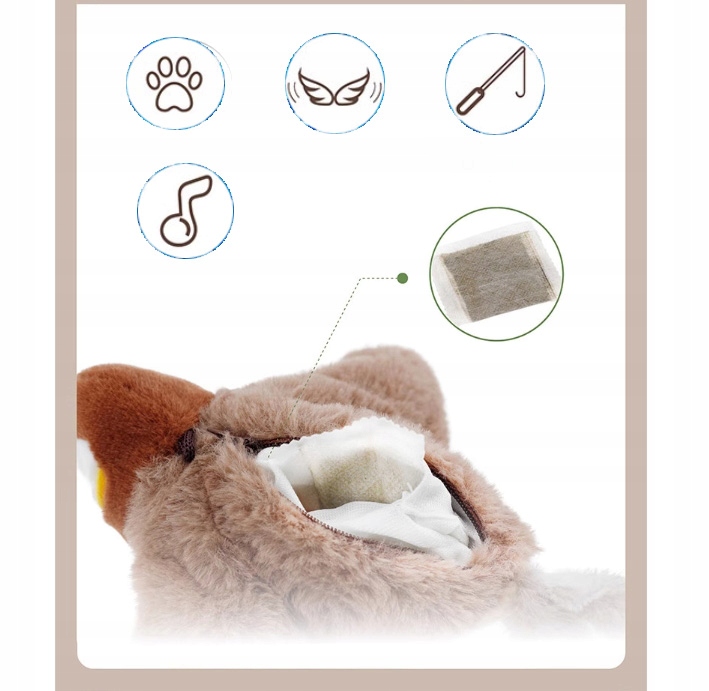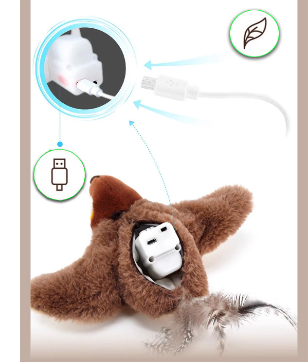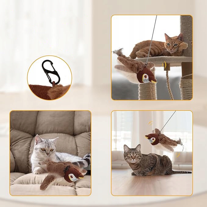Інтерактивна іграшка для кота з сенсорним датчиком. Коли кішка кидає його, горобець автоматично махає крилами та чверті, заохочуючи кішку кусати і зчепитися. Якщо іграшка більше не торкається, вона через деякий час зупиняється, щоб заощадити енергію і починати знову, коли кіт стрибає на неї. Завдяки 3 різним частотам руху, іграшка для кішки з птахом забезпечить кота в будь -який час доби.
