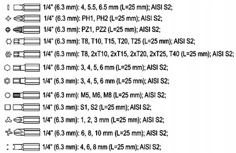В набір входять насадки з твердої сталі S2. Набір дозволяє виконувати роботи, що вимагають дуже високих навантажень і точності, а також дозволяє виконувати багато сервісних робіт, пов'язаних з відгвинчуванням і загвинчуванням різьбових з'єднань різних номінальних розмірів.