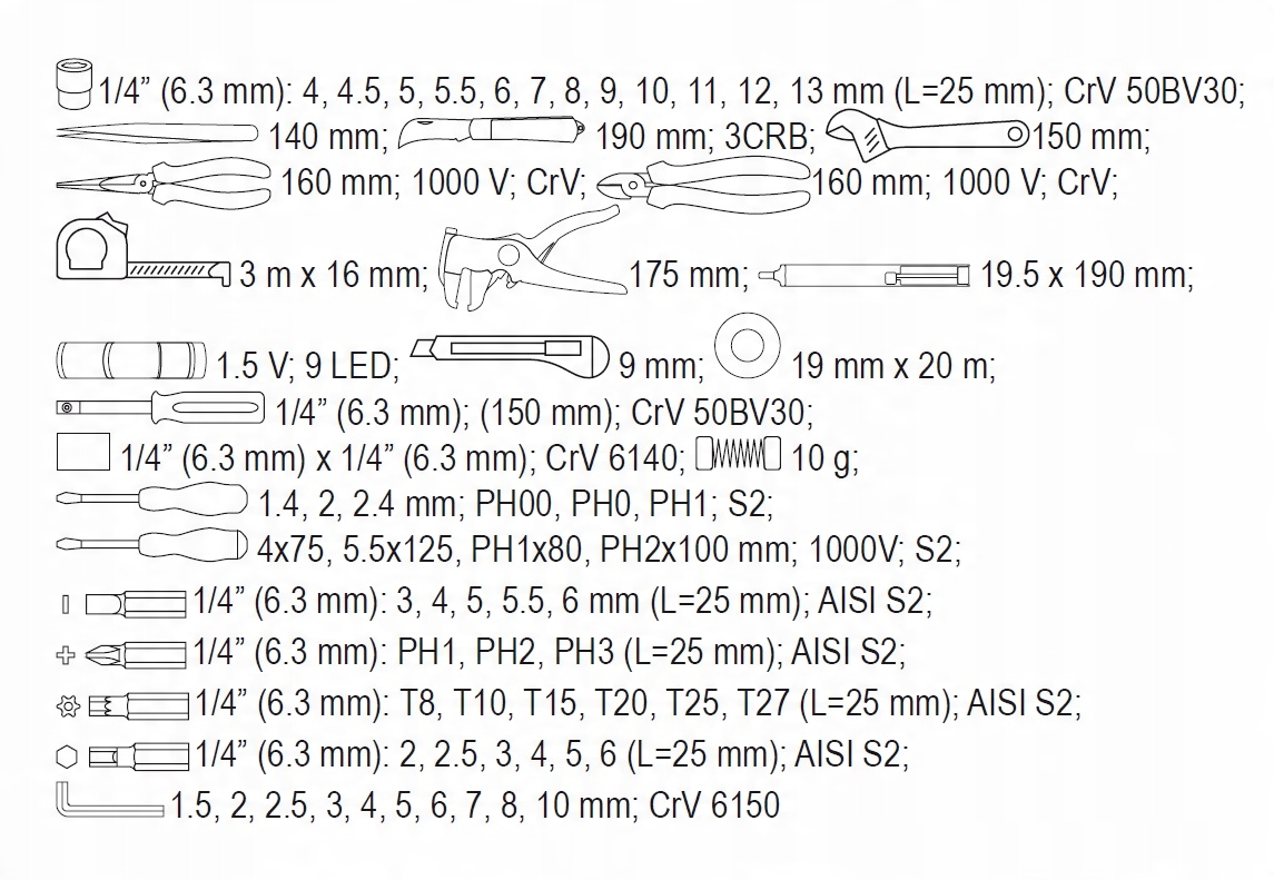 Професійний інструмент для електриків. Містить 68 Спеціально вибраних інструментів. Це відмінна пропозиція як для електричної установки, так і для автомобільної промисловості. Плоскогубці та викрутки, що входять до встановленого, ізольованого до ручок VDE 1000 В.
