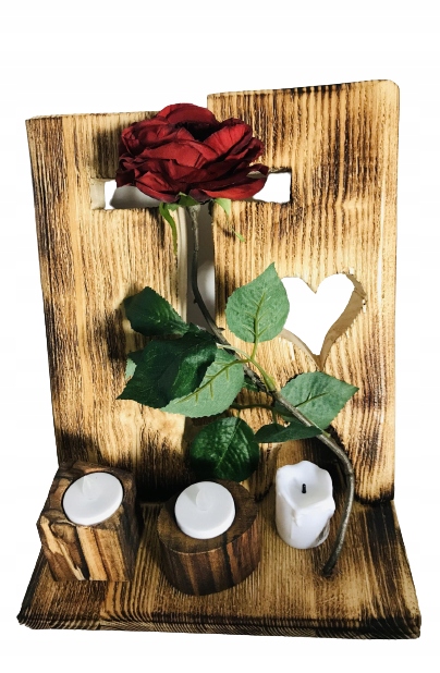 Красиві дерев'яні композиції з дерева з трояндою і вогнями.