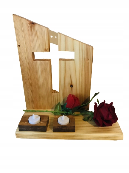 Дерев'яна надгробна композиція з трояндою та вигравіруваними вогнями - це продукт, створений від початку до кінця польським виробником.