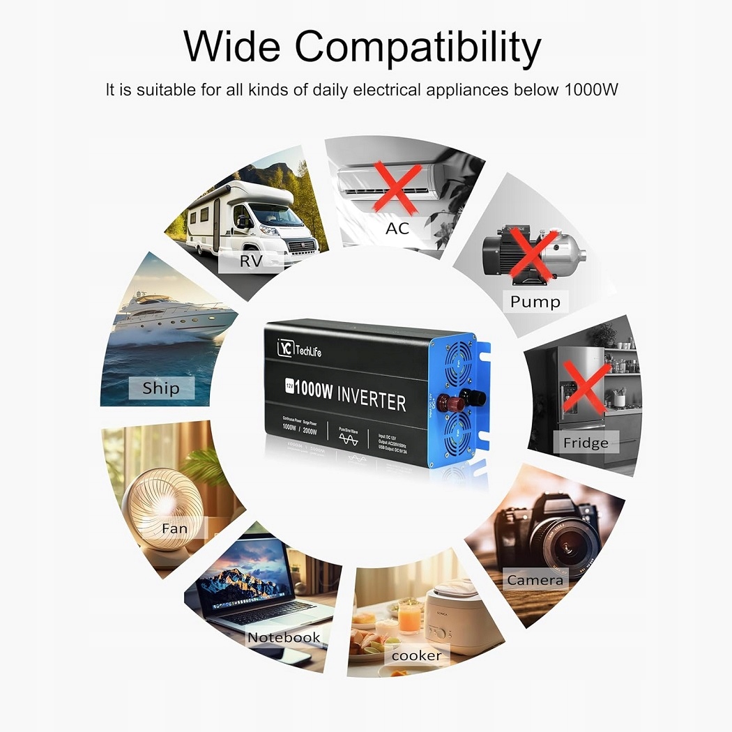 - Інвертор синусоїдальної хвилі потужністю 1000 Вт з 1 розеткою змінного струму та 2 портами USB може бути сумісний із різними програми. Ідеальний автомобільний інвертор для ноутбука, вентилятора, ігрової консолі, кухні, телевізора, аудіо колонок, молоковідсмоктувача. Ідеально підходить для використання у відпустці, подорожі, вдома або на вулиці в надзвичайних ситуаціях, під час кемпінгу. Крім того, автомобільна потужність 1000 Вт сумісна з AGM, літій-іонними та свинцево-кислотними батареями.