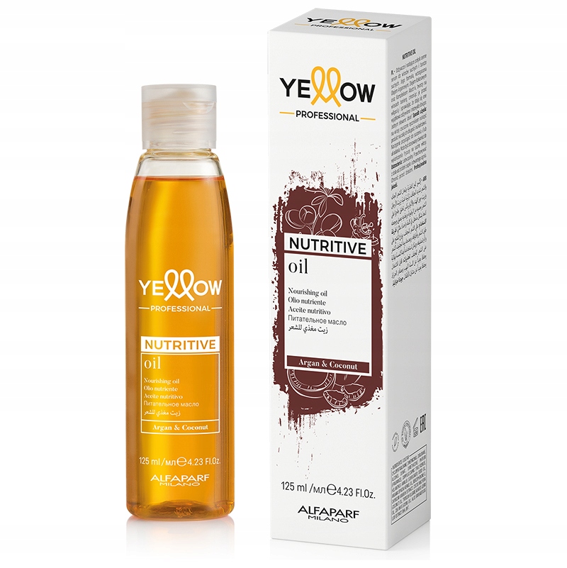 Yellow Nutritive Leave-in Argan & Coconut oil hair — сироватка з блискучими та регенеруючими властивостями, призначена для сухого та дуже сухого волосся. Завдяки натуральним інгредієнтам, таким як арганова олія та екстракт кокоса, засіб зволожує волосся, робить його м’яким і позбавляє від так званого ефекту обважнення. Сироватка, нанесена на вологі кінчики волосся, чудово скріплює їх і повертає їм колишній блиск. Жовта поживна незмивна олія аргани та кокосу також забезпечує захисний бар’єр від вологи та несприятливих умов для волосся.