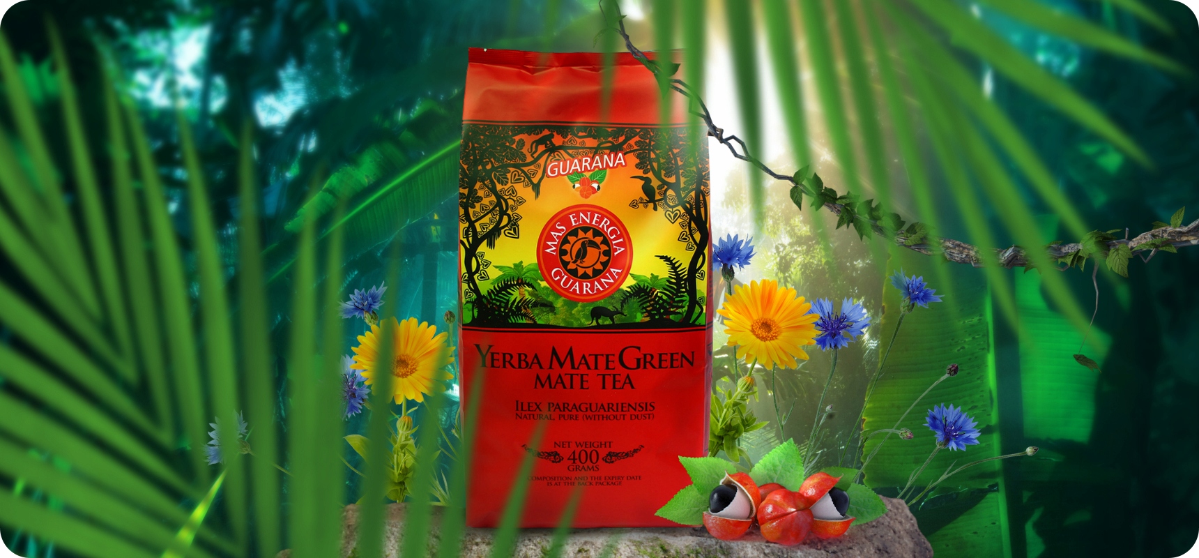 - yerba mate (ilex paraguariensis) 93% - найкращий зелений єрба -товариш верхнього -класу - димчасті сушені з гарячим повітрям, країна оригіналу: Бразилій Amazon Guarana додавання злегка деревного смаку та аромату. Вважається природною стимулюючою рослиною. yerba mate.