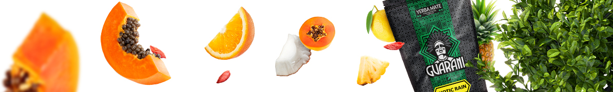 Guarani Exotic Rain – це пропозиція тропічного смаку від парагвайського бренду йерба мате. Виразний, гіркуватий і димчастий смак падуба доповнюється насиченим міксом фруктових добавок, які не тільки відчуваються на смак, але й буквально «з’їдаються» очима – така йерба виглядає дуже апетитно. Оригінальна та смачна композиція включає: відомі та ціновані багатьма суперфуди - ягоди годжі, сушені шматочки манго, солодке, кубики ананаса з цукатами та папайя, злегка терпка апельсинова шкірка, яка порушує солодкий смак інших добавок, і велика біла кокосова стружка. Все виглядає неймовірно, а після приготування буквально переносить вас на тропічний острів!