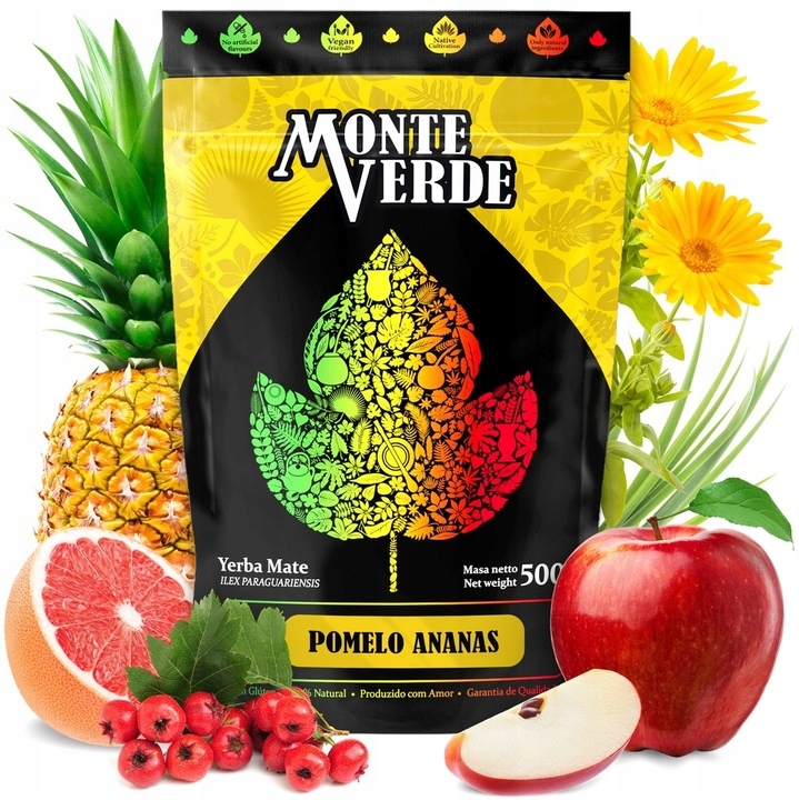 Йерба мате Монте Верде Помело Ананас – тропічний фьюжн в основному з листя йерба, шматочків сушеного ананаса з додаванням ягід глоду і лимонної трави і натурального ароматизатора помело. Все це скріплюється золотистим листям чорнобривців і ароматною освіжаючою м’ятою. Багатий, чудовий склад суміші забезпечує чудові смакові відчуття. Все добре працює як у теплому, так і у вигляді холодного терере.