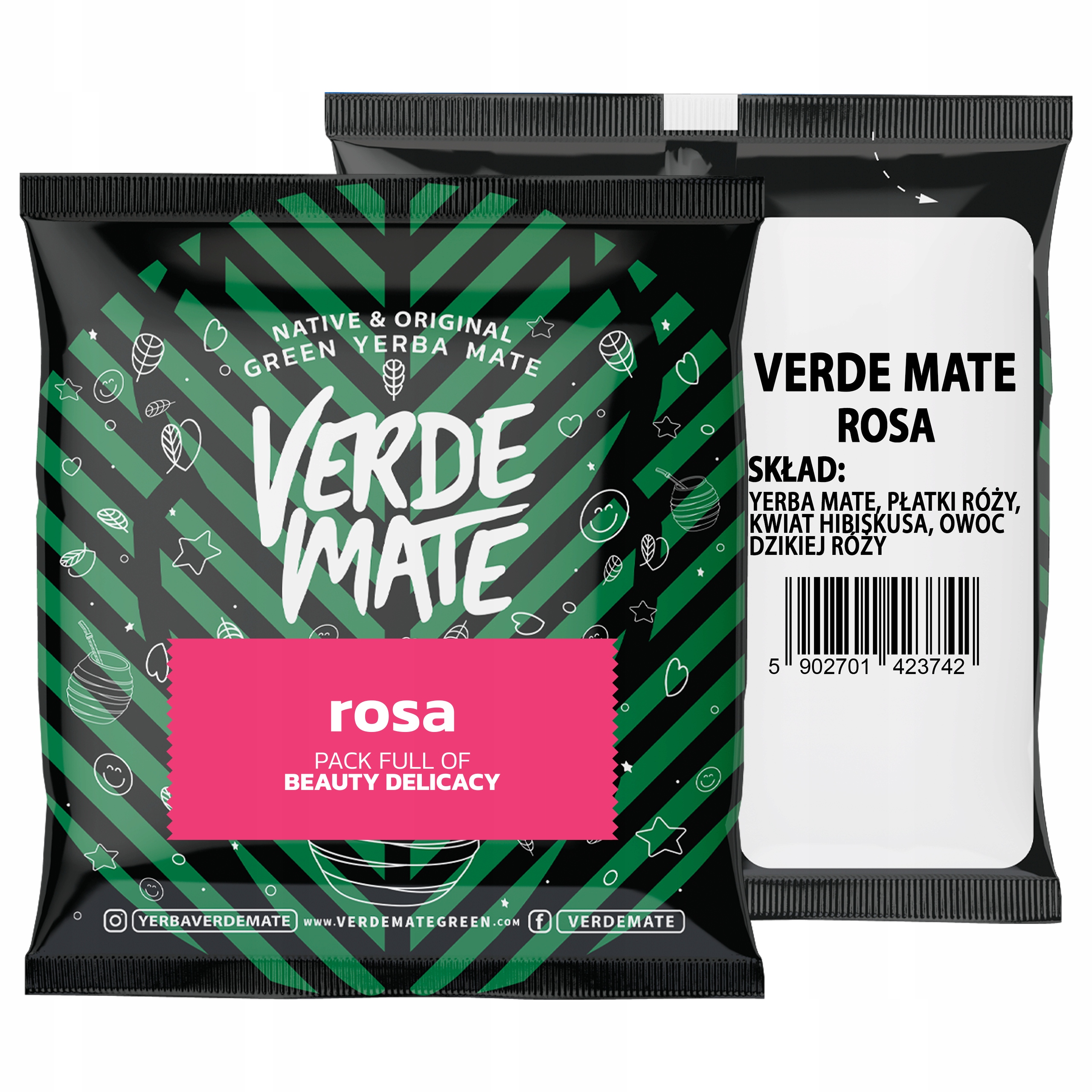 Verde Mate Rosa — це композиція зеленого йерба мате з пелюстками троянд і ягодами та гібіскусом. Оригінальні аксесуари надають всьому справжньому чуттєвий характер. Суміш характеризується тонким ароматом і збалансованим смаком. На додаток до найвищої якості відчуття для почуттів, він також має низку цінних функціональних властивостей.
