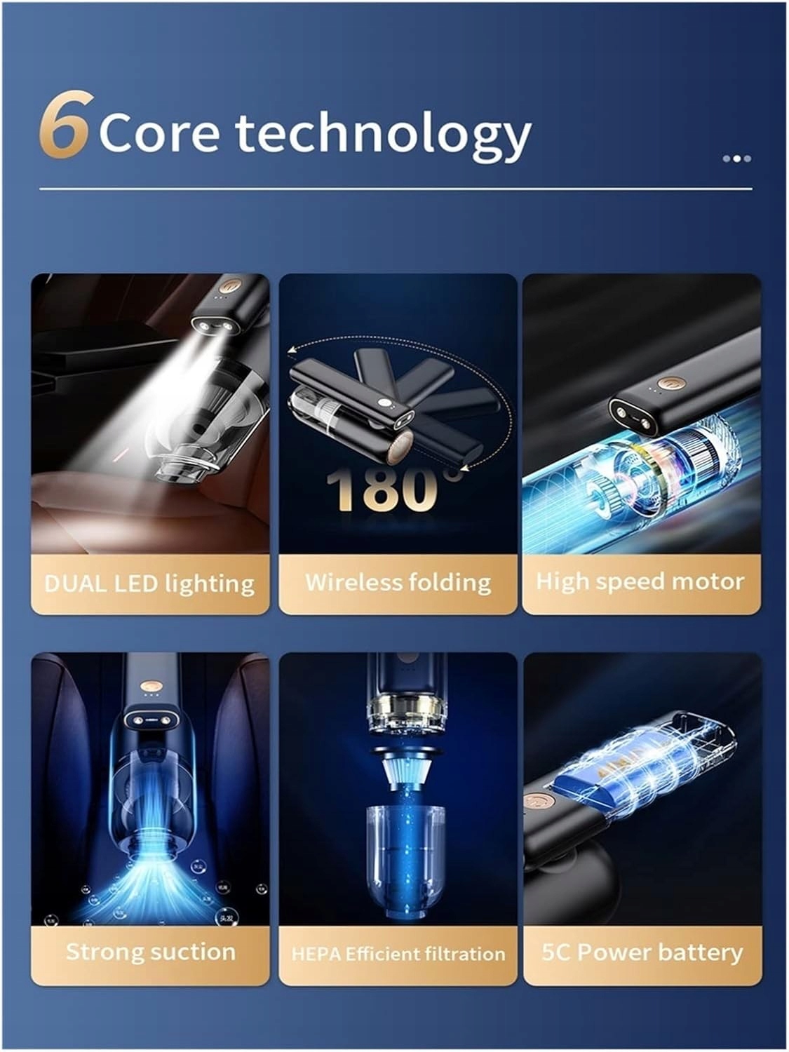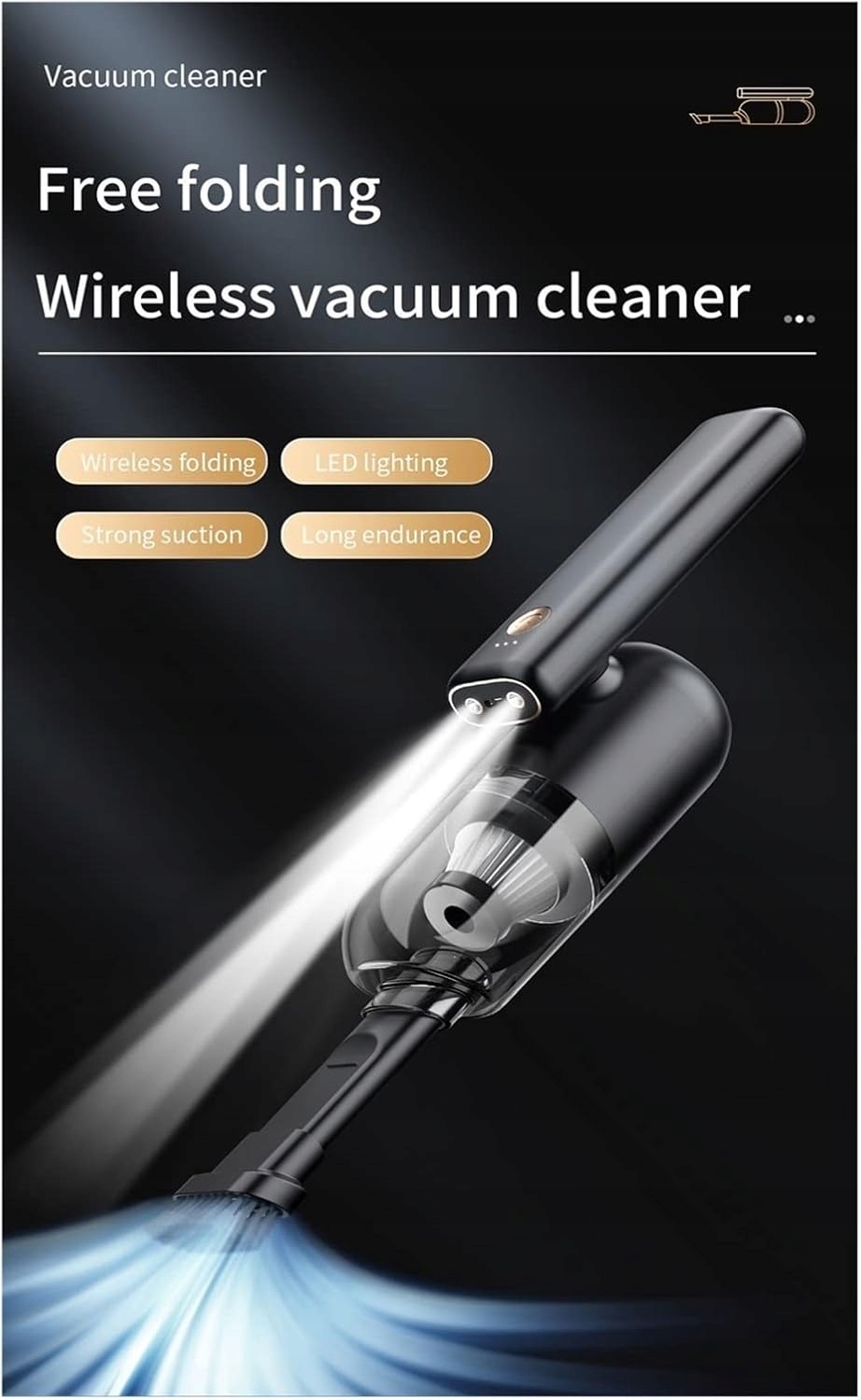 Висока довговічність Після заряджання весь транспортний засіб є високопродуктивним літієвим акумулятором ємністю 4000 мАг, який можна безперервно використовувати протягом 30 хвилин. Завдяки інтерфейсу заряджання Type-C портативний зовнішній ремінь можна заряджати в будь-який час високоефективний високошвидкісний двигун, сильне та стабільне всмоктування більш довговічний низький рівень шуму 60000 об/хв низький рівень шуму 75 дБ Більша площа фільтрації набору фільтруючих елементів HEPA Циклонна структура відцентрового циклону Перегородка фільтра HEPA для запобігання вторинному забрудненню, викликаному розрядом сітчастий фільтр пиловмісних газів також можна мити водою Багатофункціональна насадка, здатна поглинати енергію та підмітати широку щітку насадка смужка насадка тристороння насадка хороший помічник в автомобілі Потужне подвійне світлодіодне освітлення можна використовувати окремо освітлення та можна використовувати безперервно протягом 10 днів із великою практичністю та широким застосуванням