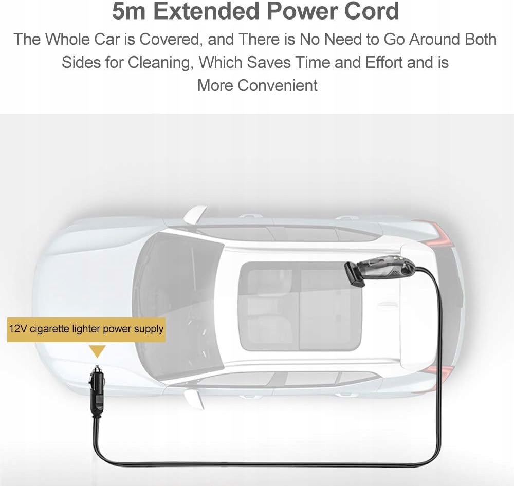 Надзвичайно ефективний фільтр Цей автомобільний пилосос має дуже ефективний фільтр HEPA, який фільтрує 999 частинок із повітря, і його можна мити. Він фільтрує, серед іншого, кліщів та їхні яйця, бактерії та пилок. Автомобільний пилосос 5000 Па120 Вт. Цей ручний пилосос має високу потужність 120 Вт і забезпечує стабільну потужність всмоктування до 5000 Па і швидкість обертання до 30 00 об/хв, завдяки чому волосся, плями та інші грудочки швидко видаляються. дрібний бруд. Багатофункціональні аксесуари Цей автомобільний пилосос включає різні аксесуари, включаючи багатофункціональні насадки та подовжувачі, які дуже підходять для легкого прибирання різноманітних відходів. Вологе та сухе використання Цей ручний пилосос можна використовувати як для вологого, так і для сухого використання. Легко очищає пил, шерсть тварин, пролите молоко і будь-яку рідину. Крім того, цей ручний пилосос легкий і його легко носити з собою. Його можна покласти у валізу і він не займає багато місця. Акумуляторний ручний пилосос Акумуляторний ручний пилосос містить шнур живлення довжиною 5 м, за допомогою якого можна очистити будь-яку частину автомобіля. Він живиться від прикурювача автомобіля.