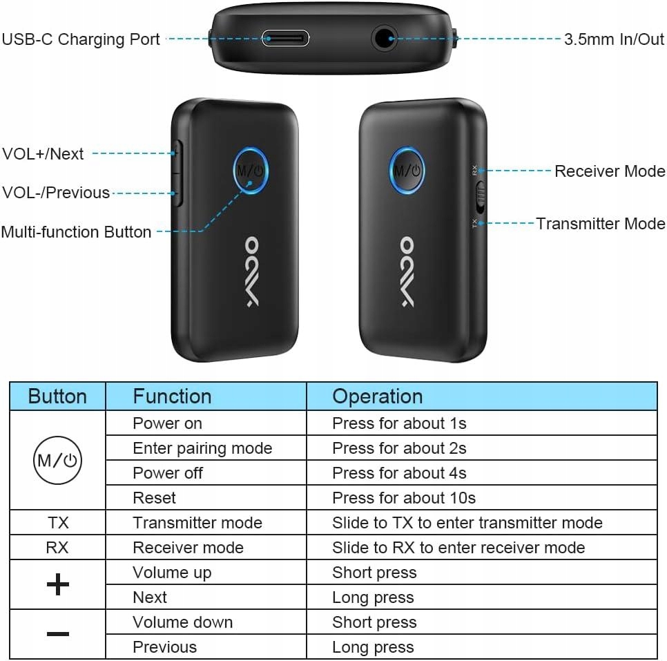 - 【Подвійне з’єднання, поділіться своїм щастям】 Передавач Bluetooth можна об’єднати в пару з двома бездротовими навушниками або динаміками Bluetooth одночасно в режимі передачі. У режимі RX ви можете підключатися до Bluetooth двох мобільних телефонів одночасно. Ви можете поділитися аудіо з друзями та близькими. Зверніть увагу, що затримка аудіо буде посилена в подвійному режимі, очікується висока затримка 200 мс