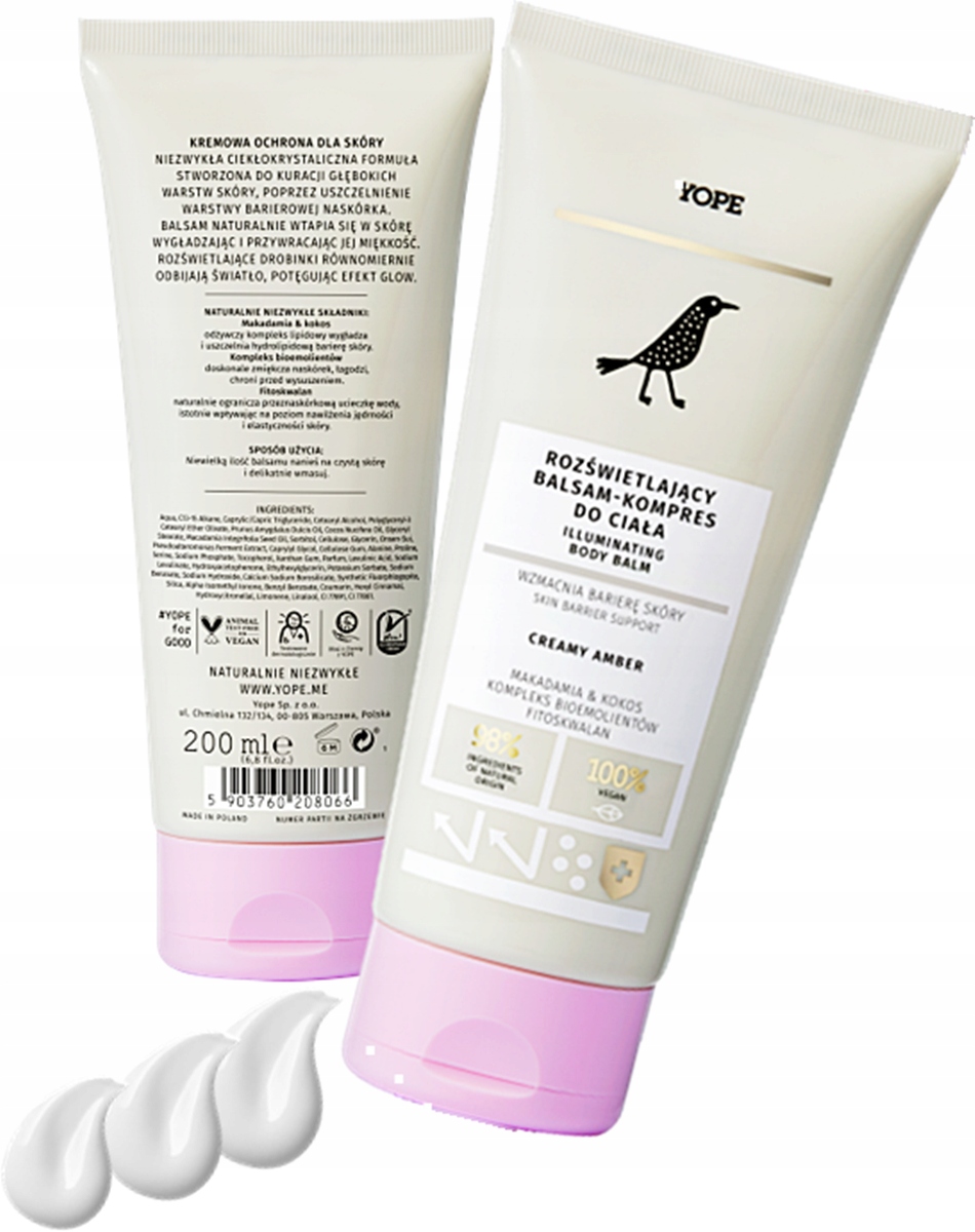 Yope Creamy Amber освітлюючий лосьйон для тіла, який діє як компрес, який захищає та зміцнює шкірний бар’єр. Він має рідкокристалічну формулу, розроблену для лікування глибоких шарів шкіри шляхом ущільнення бар’єрного шару епідермісу. Бальзам швидко вбирається, розгладжує шкіру та повертає їй м'якість. Містить сяючі частинки, які відбивають світло, створюючи ефект сяйва.